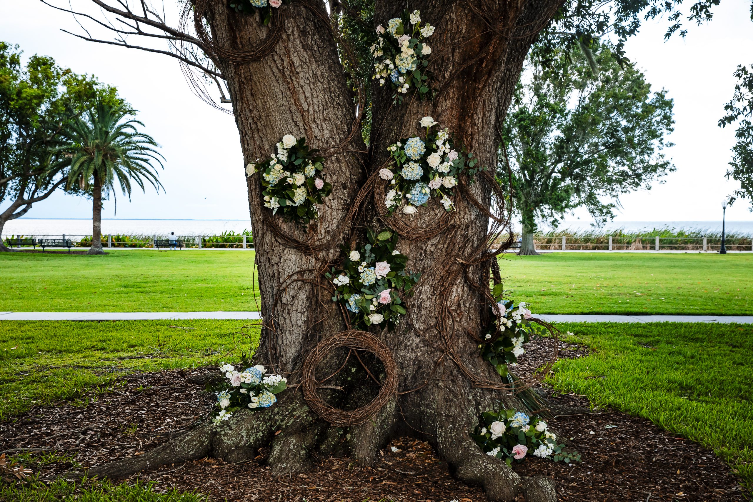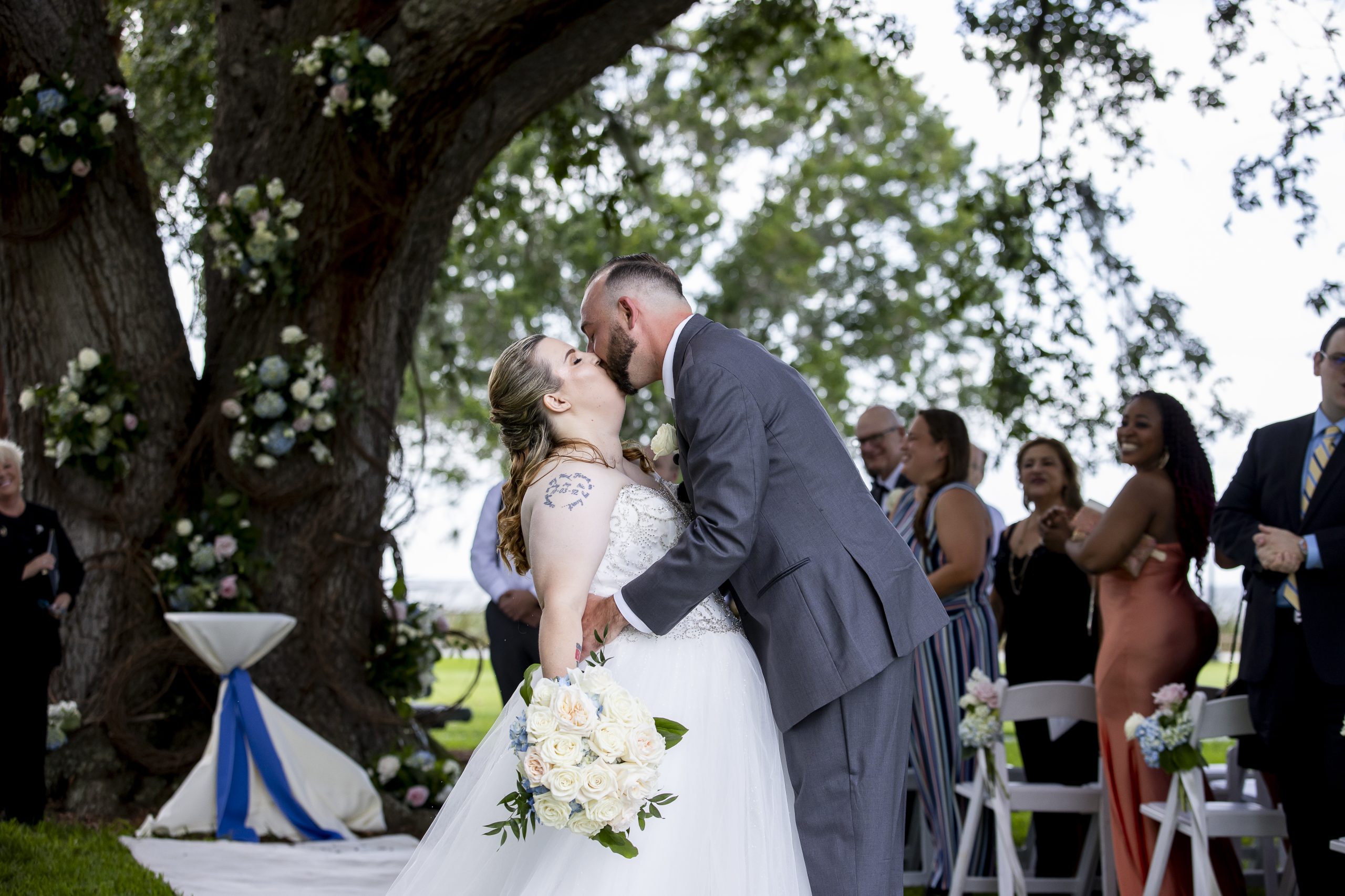 Their blue and white wedding ceremony took place on the lawn at Tanner Hall. There, a gorgeous tree decorated with grapevine wreaths, hydrangeas, and roses stood tall, awaiting the bride and groom. The lake sparkled in the background, adding even more depth and beauty to this ceremony backdrop.