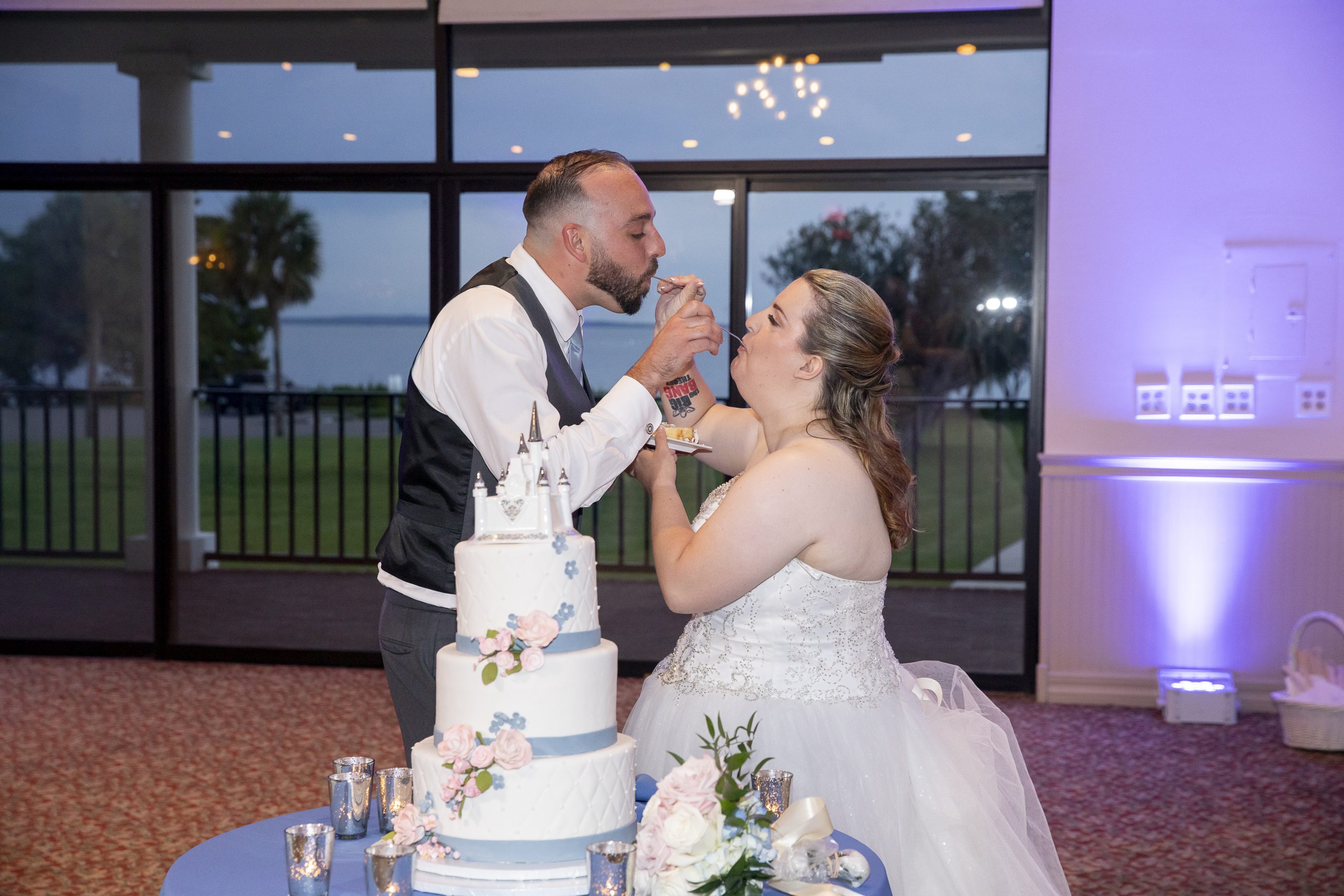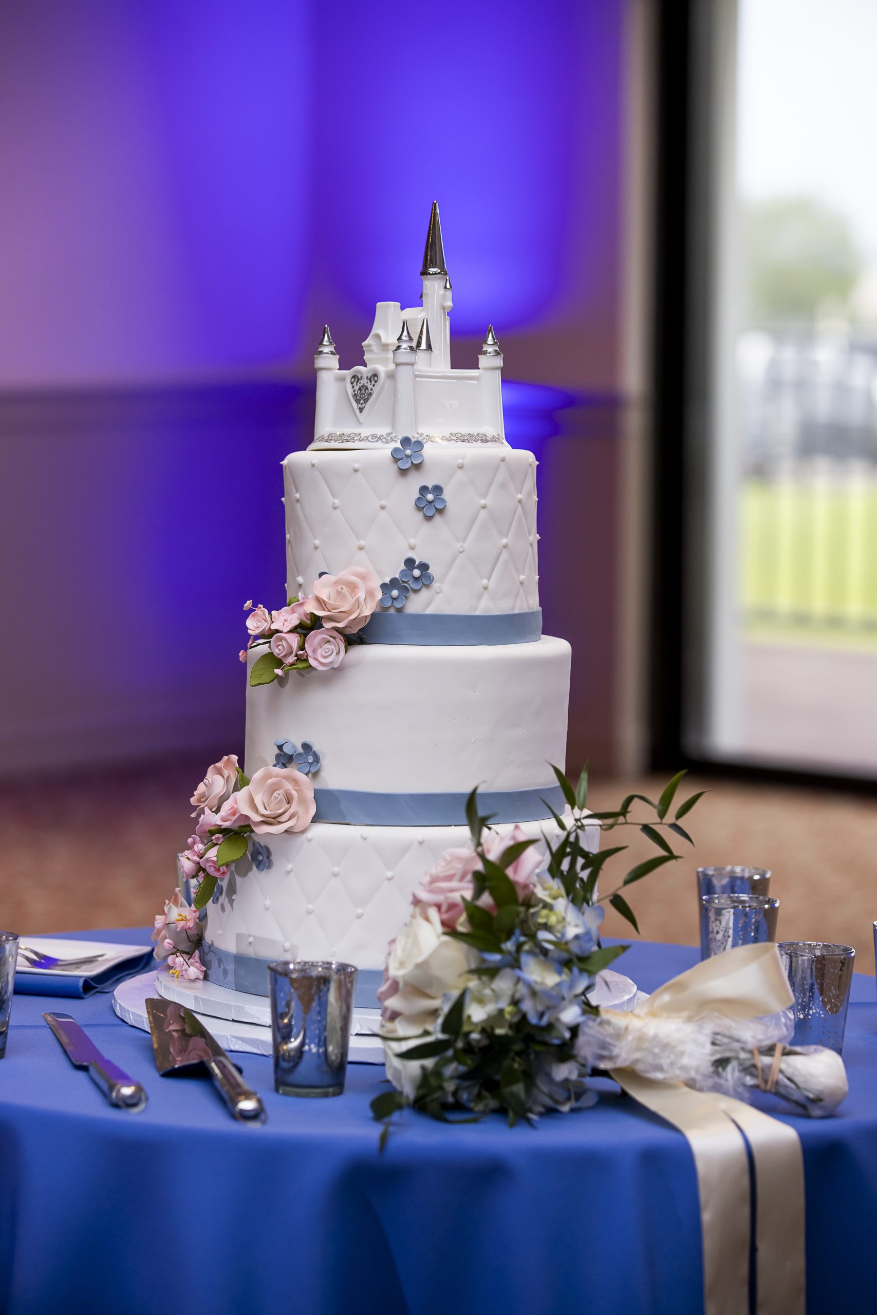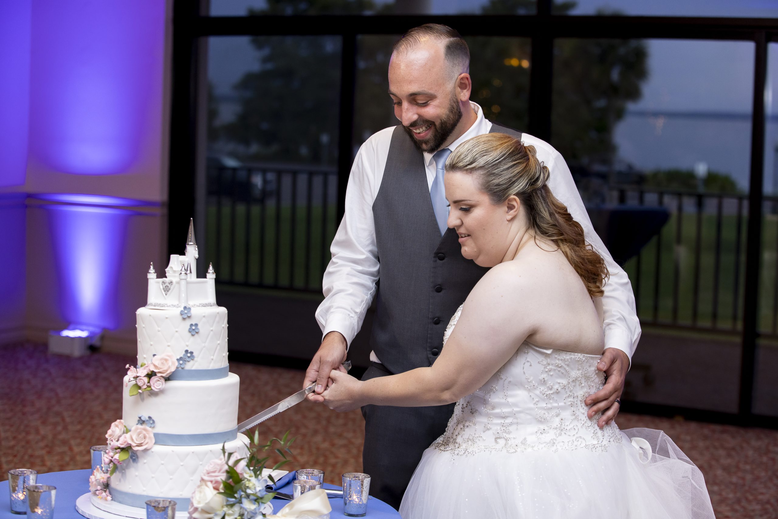 Cake cutting followed the conclusion of dinner. Kelsey and Kyle are big Disney fans, so they opted for a 3-tiered blue and white wedding cake with a Cinderella castle topper! Crafted by It’s Tasty Too, their cake flavors included amaretto, red velvet, and peanut butter, all of which were hits with everyone in attendance!