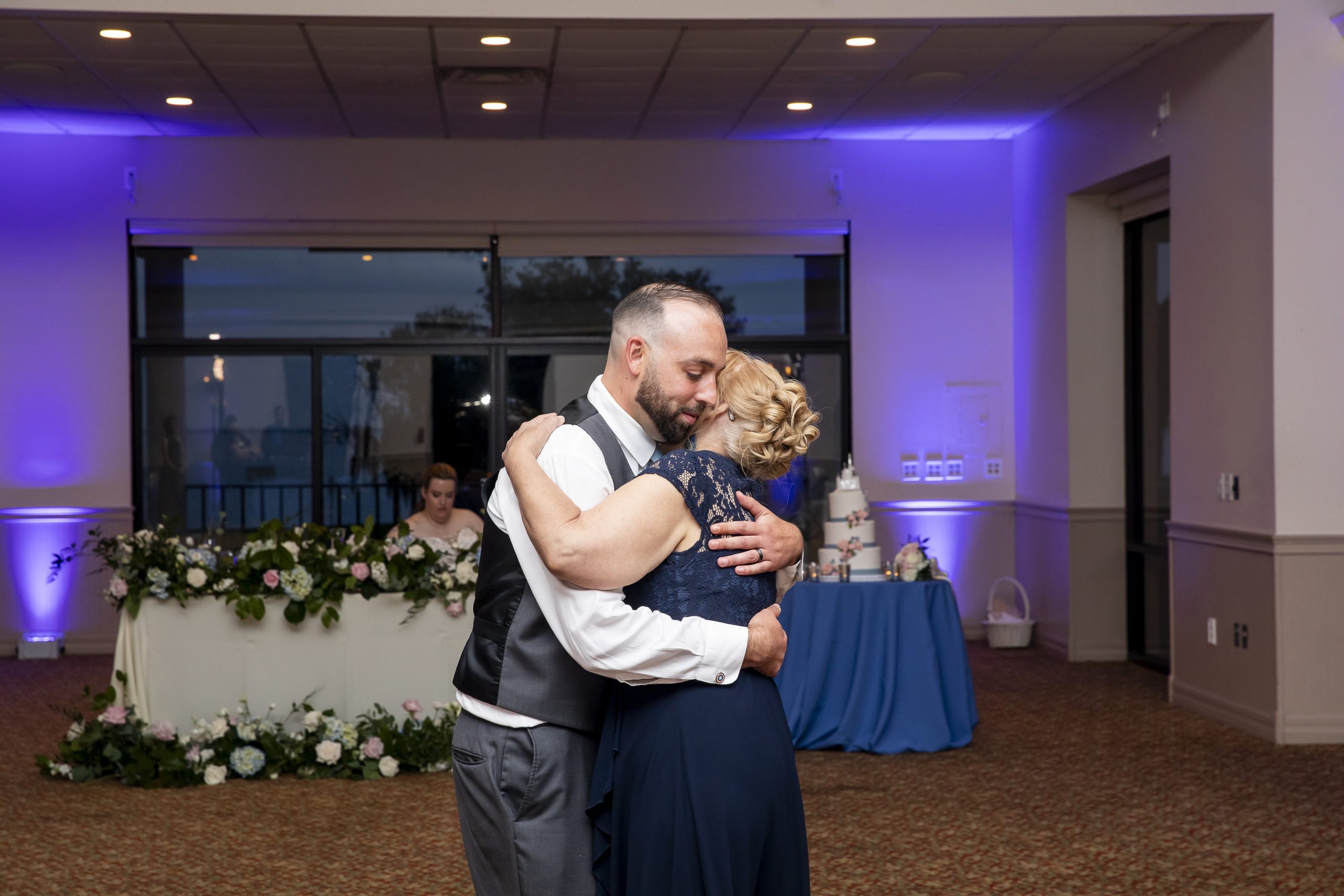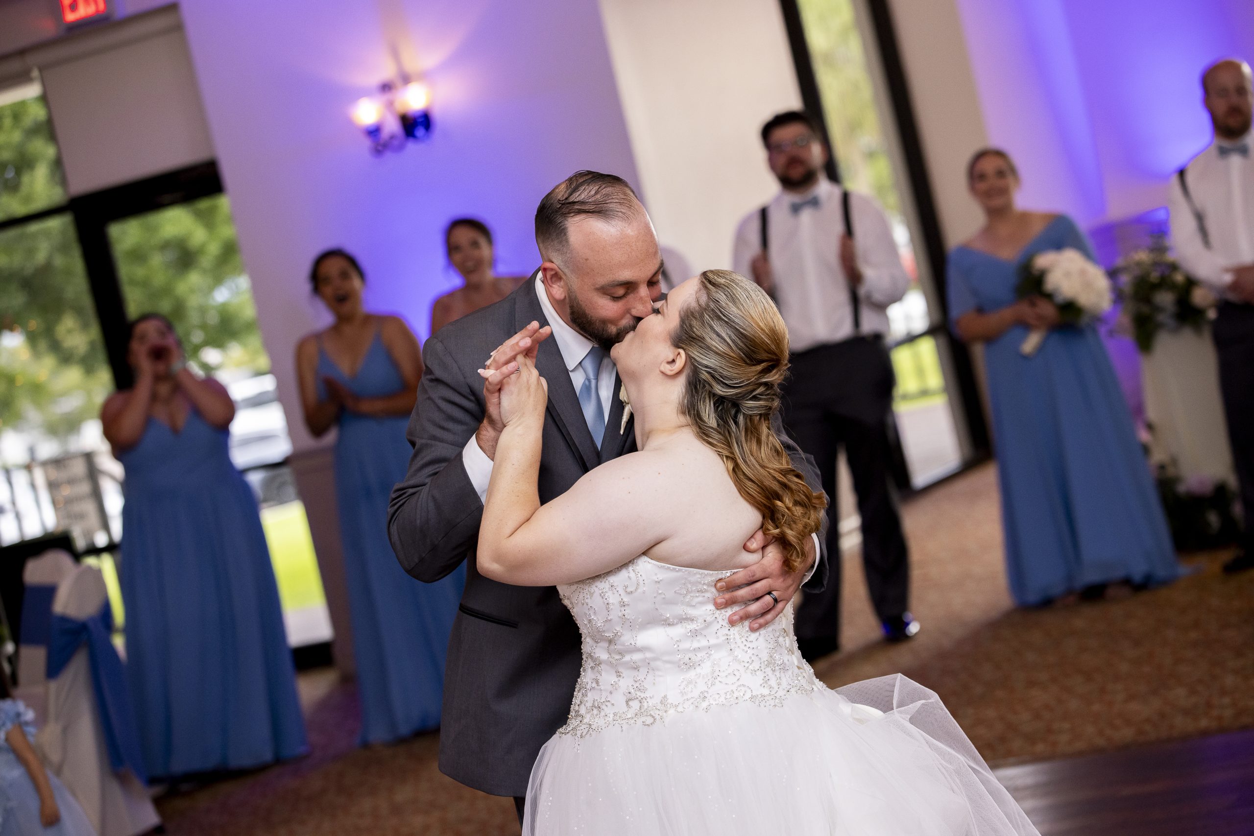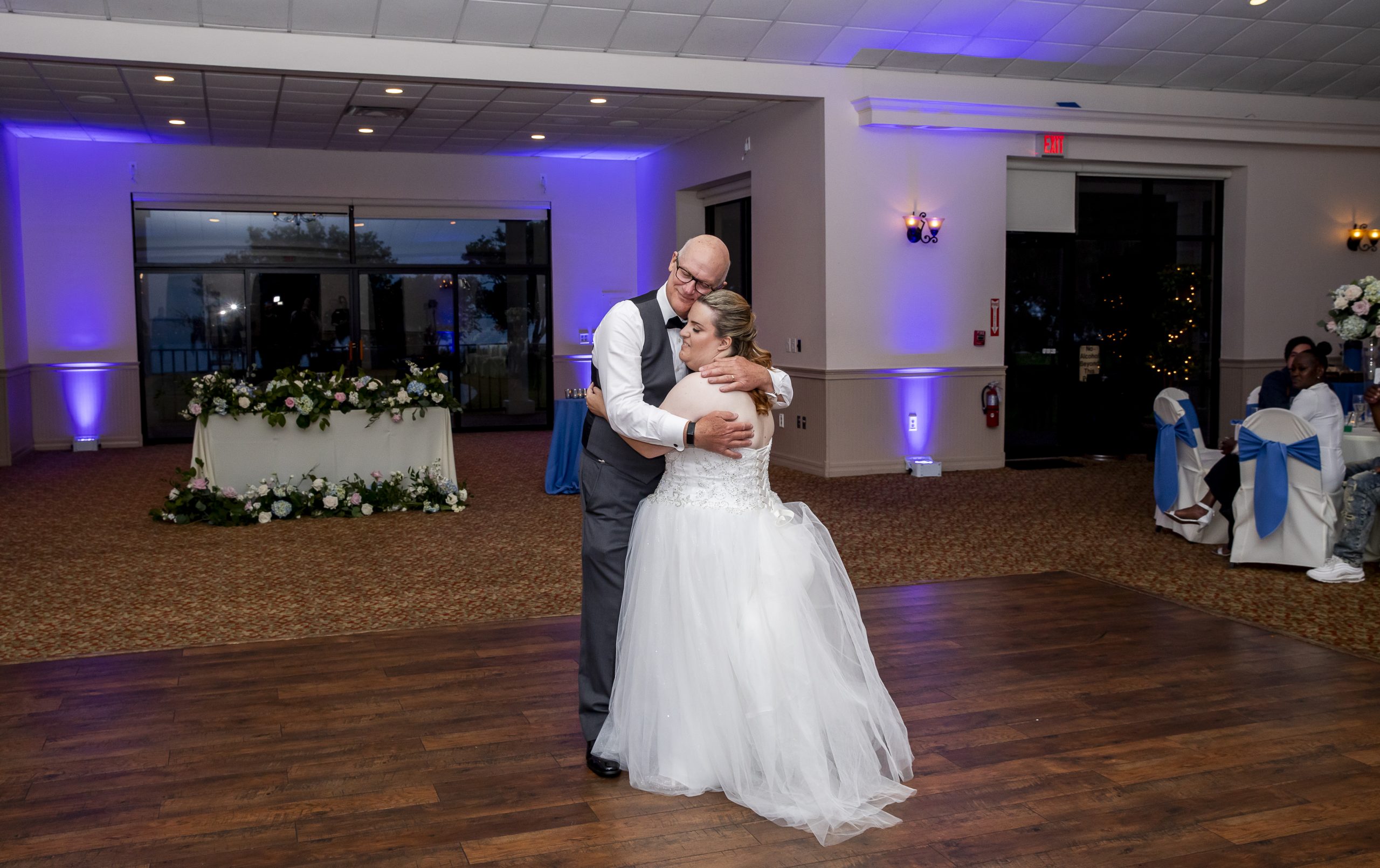 Cake cutting followed the conclusion of dinner. Kelsey and Kyle are big Disney fans, so they opted for a 3-tiered blue and white wedding cake with a Cinderella castle topper! Crafted by It’s Tasty Too, their cake flavors included amaretto, red velvet, and peanut butter, all of which were hits with everyone in attendance!