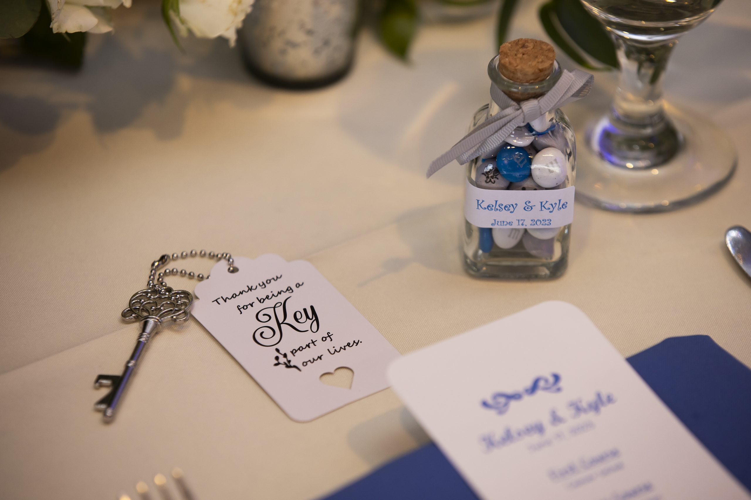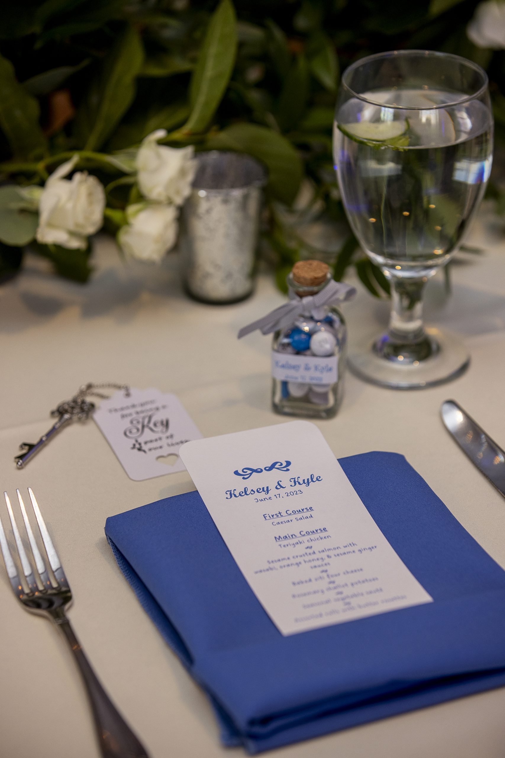 As the sun began to set, it was time to move into the main Ballroom for this blue and white wedding reception. Each guest table had ivory linens, a tall blue and white floral centerpiece, and slate blue linen napkins with a dinner menu tucked inside. We also set mini blue and white wedding favors at each place setting, which consisted of clear jars of M&Ms. Kelsey and Kyle also gifted their loved ones a skeleton key that a tag that read “Thank you for being a key part of our lives.”