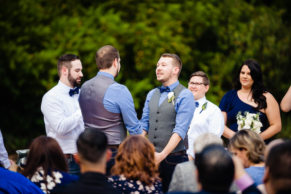 The grooms looked very handsome in navy blue long sleeve shirts with charcoal vests. They each wore a uniquely patterned bow tie and a boutonniere of white ranunculus.