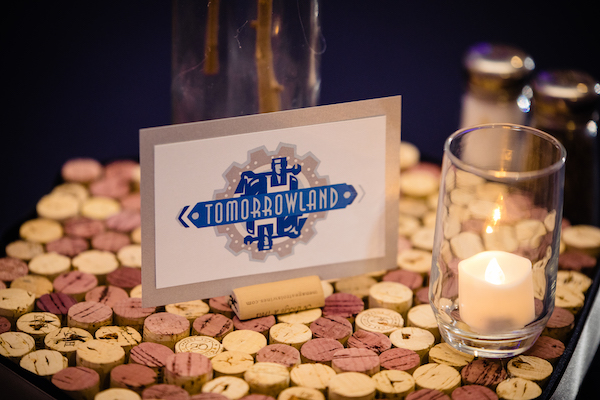 Guest tables were set with navy tablecloths and grey napkins in a cummerbund fold. Tiles of wine corks held the Walt Disney World themed table names and were surrounded by flickering candles. Chairs covered with white covers and charcoal sashes completed the look.