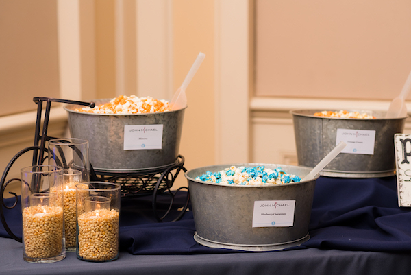 After dinner, guests were treated to our John Michael Exquisite Weddings and Catering Popcorn Bar. The grooms chose Orange Cream, Mimosa and Blueberry Cheesecake for their flavor selections. Our team handled all of the bags, scoops, popcorn display décor and set up.
