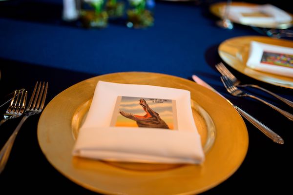 Guest tables were draped with rich Navy blue linen with gold charger plates and clean crisp white napkins and a unique assortment of vintage Florida post cards.