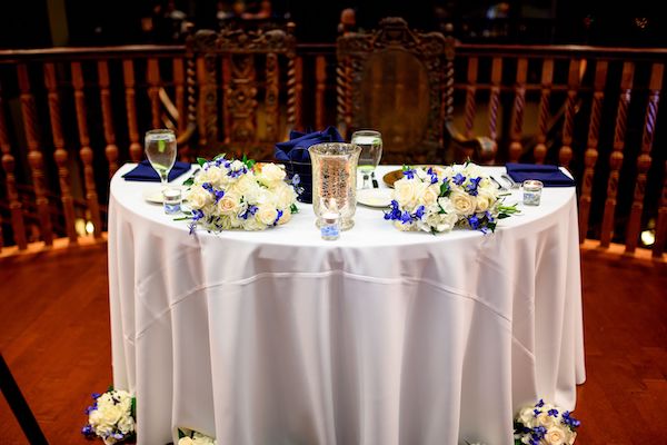 The couple’s sweetheart table was draped in white linen with Navy blue napkins and mercury glass napkins. It was also adorned with white centerpieces that included touches of blue delphinium.