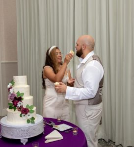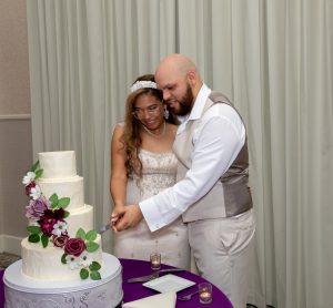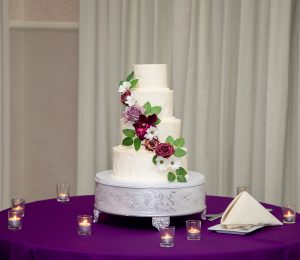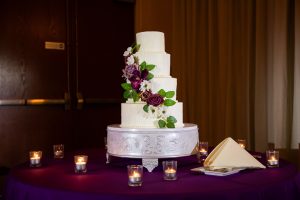 Later that night, the newlyweds cut their purple wedding cake. Provided by Scotchie’s Custom Cakes, this was a four-tier ivory wedding cake with cascading purple wedding flowers and greenery. Everyone enjoyed the different flavors, from classic vanilla to strawberry to almond.