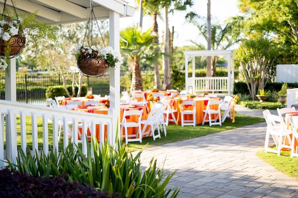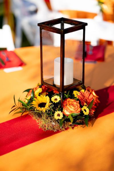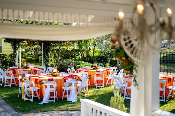 The Celebration Gardens lawn was filled with a burst of color. Round tables were set with bright orange linens and deeper orange table runners and napkins. In the center of each table sat a black metal lantern resting on a bed of orange and yellow flowers.