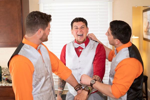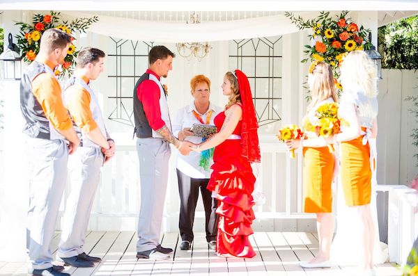 In one portion of the Wedding Cottage Adam and his groomsmen got ready, wearing bright red and orange shirts with grey vests and slacks. Across the hallway Rain got ready, wearing this brilliant red gown and veil with a crystal tiara.