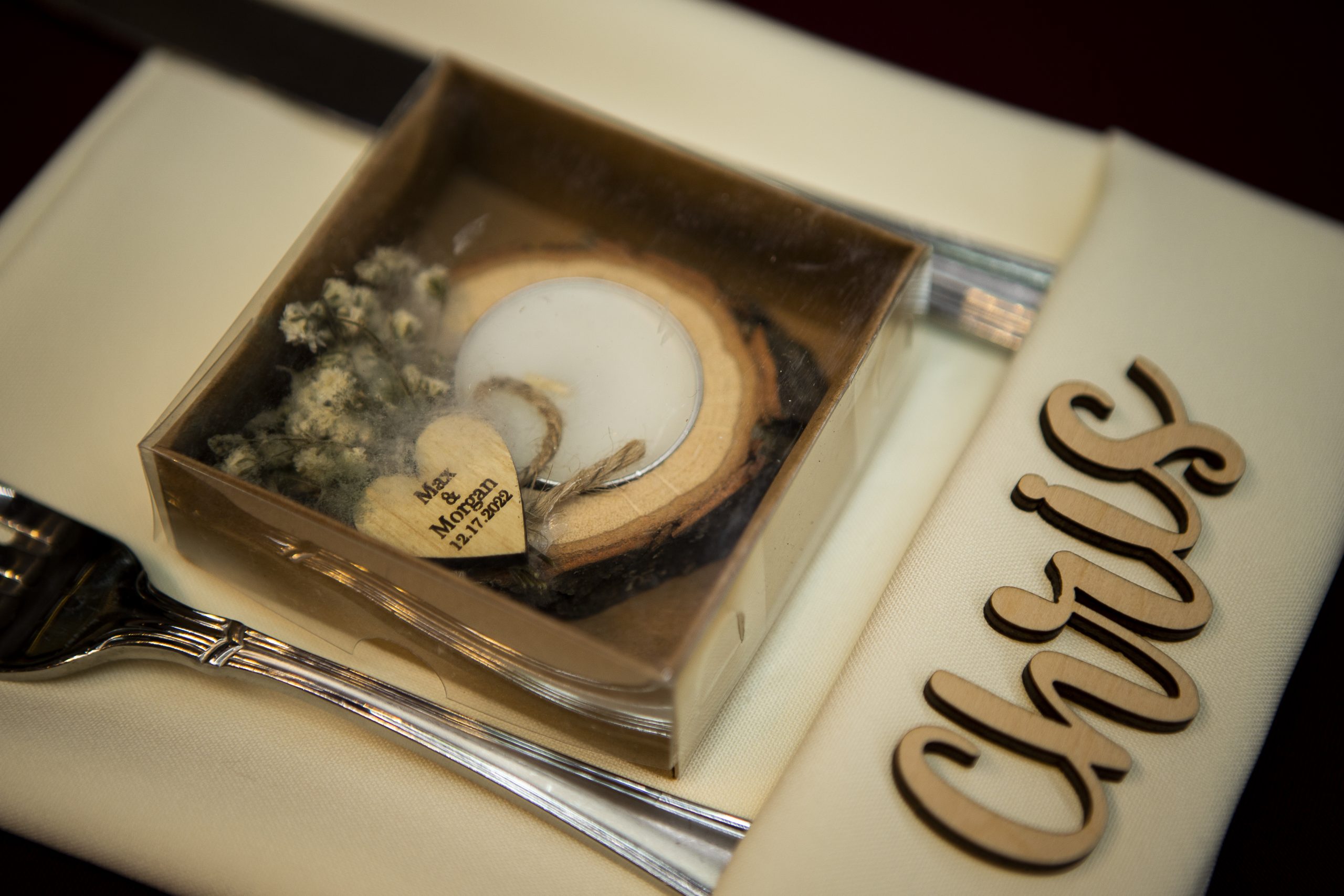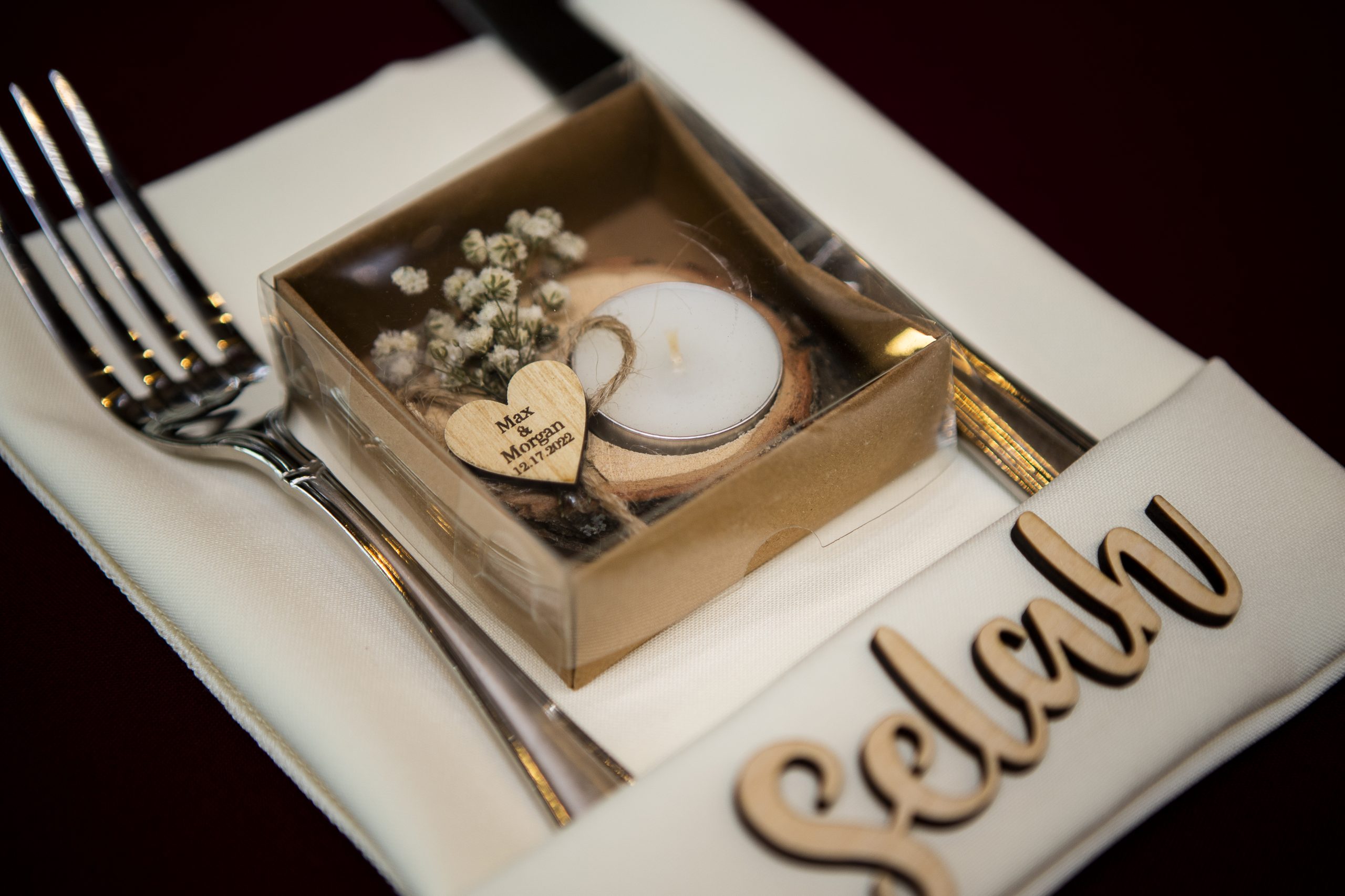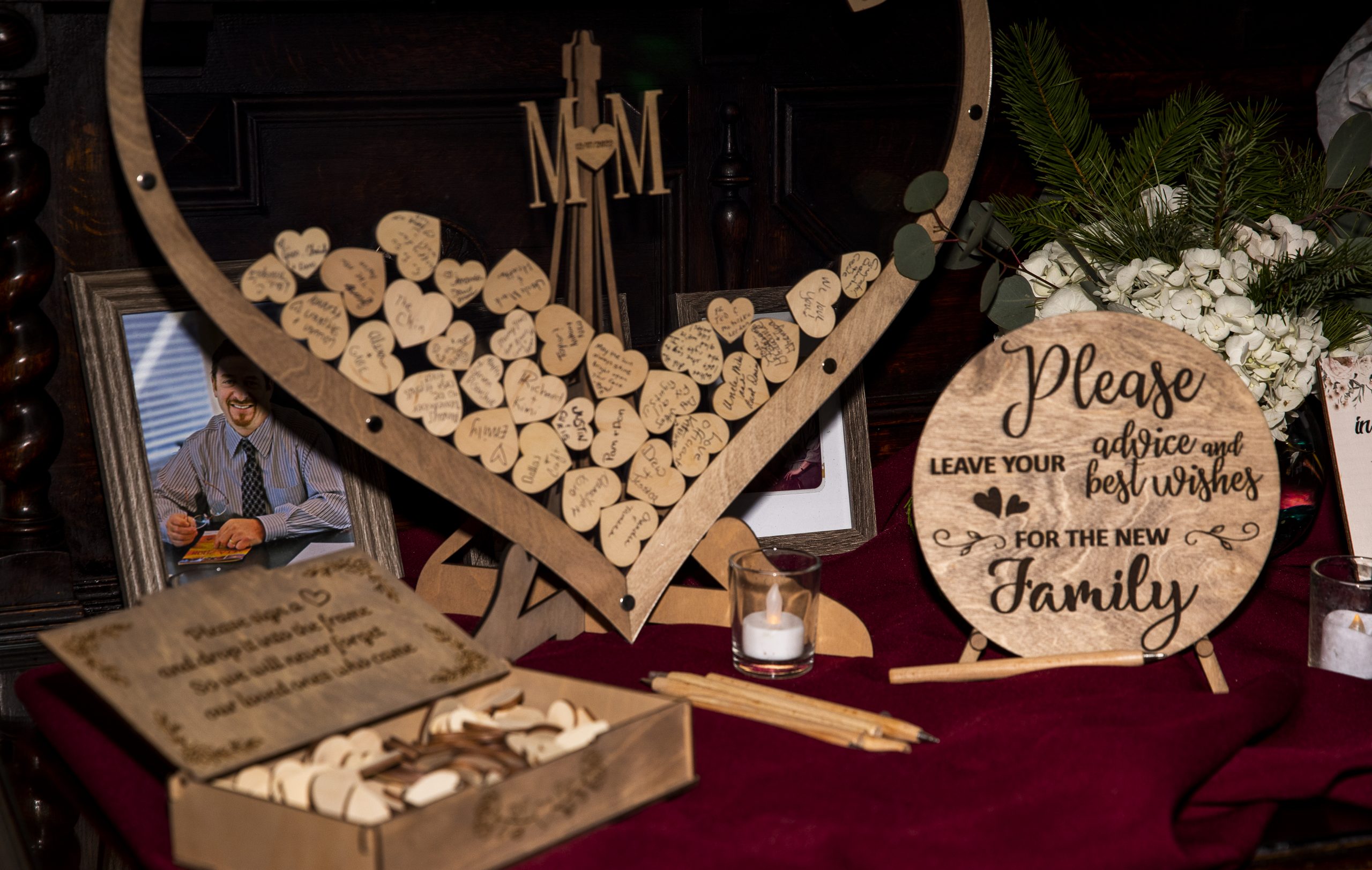 On the day of this Christmas wedding, we also set out the couple’s personal décor, including their wooden hearts guest book, framed family photos, laser-cut wooden name plates, and candles as guest favors.