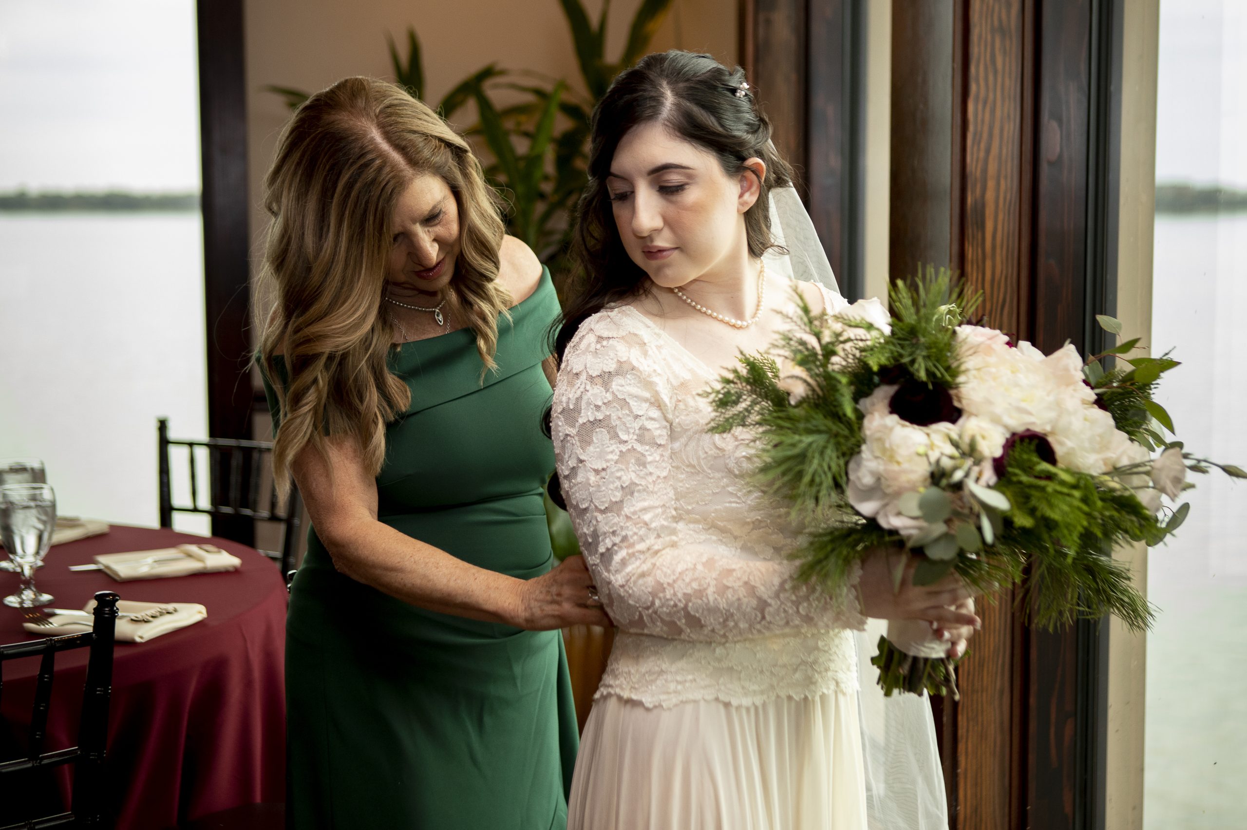 Morgan and Max’s Christmas wedding took place at Tavares Pavilion on the Lake, a beautiful indoor/outdoor wedding venue in Orlando. They held their ceremony on the lower level of the Grand Ballroom, their cocktail hour on the Pier by the water, and their reception on the upper level of the Grand Ballroom. When our team arrived at the venue on the big day, we immediately got to working setting up the wedding sites. We decorated the reception tables with burgundy linens, set the food tables with our chafers and included buffet décor, and arranged each place setting on the dining tables. These are just a few setup tasks that we do for our clients!