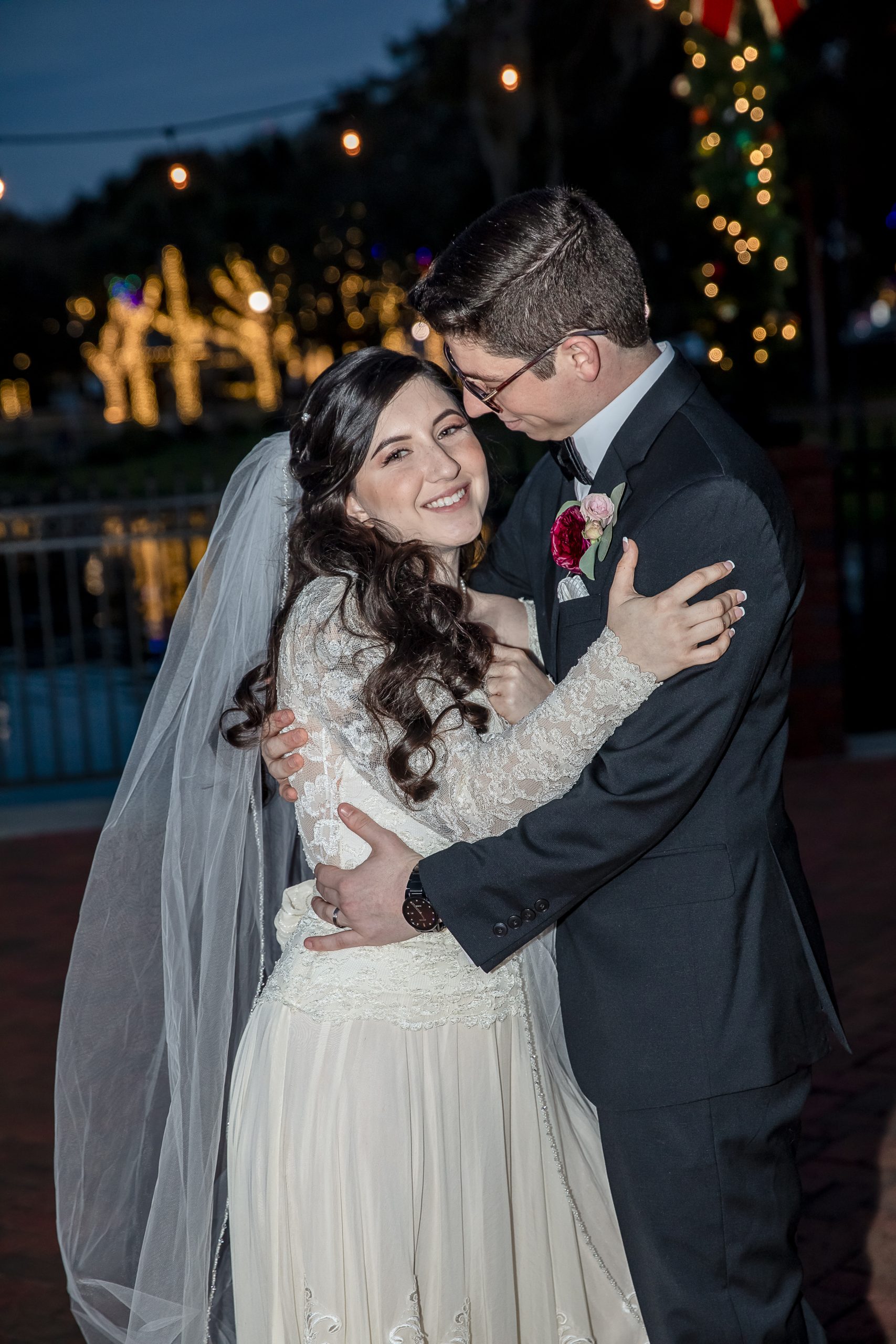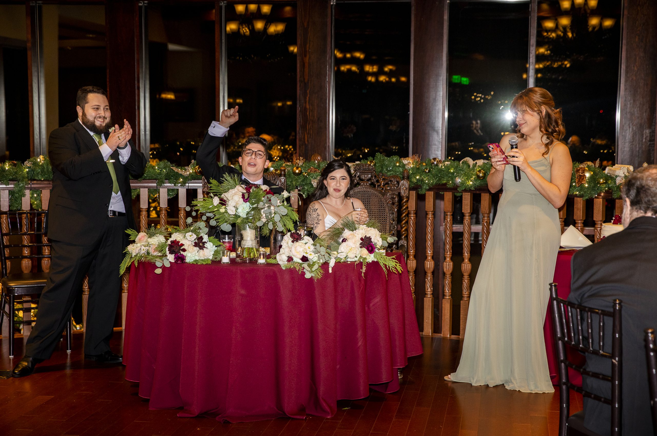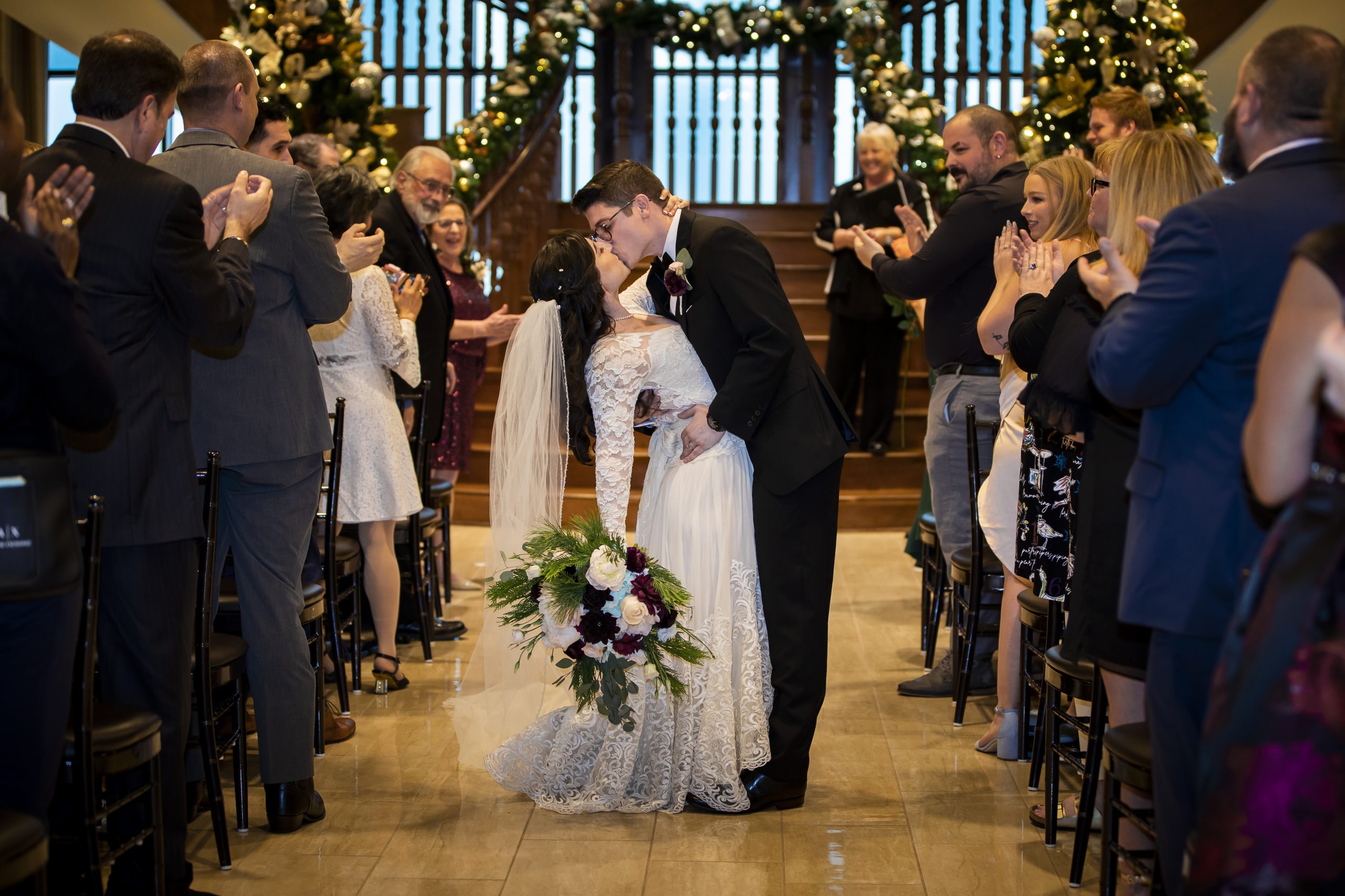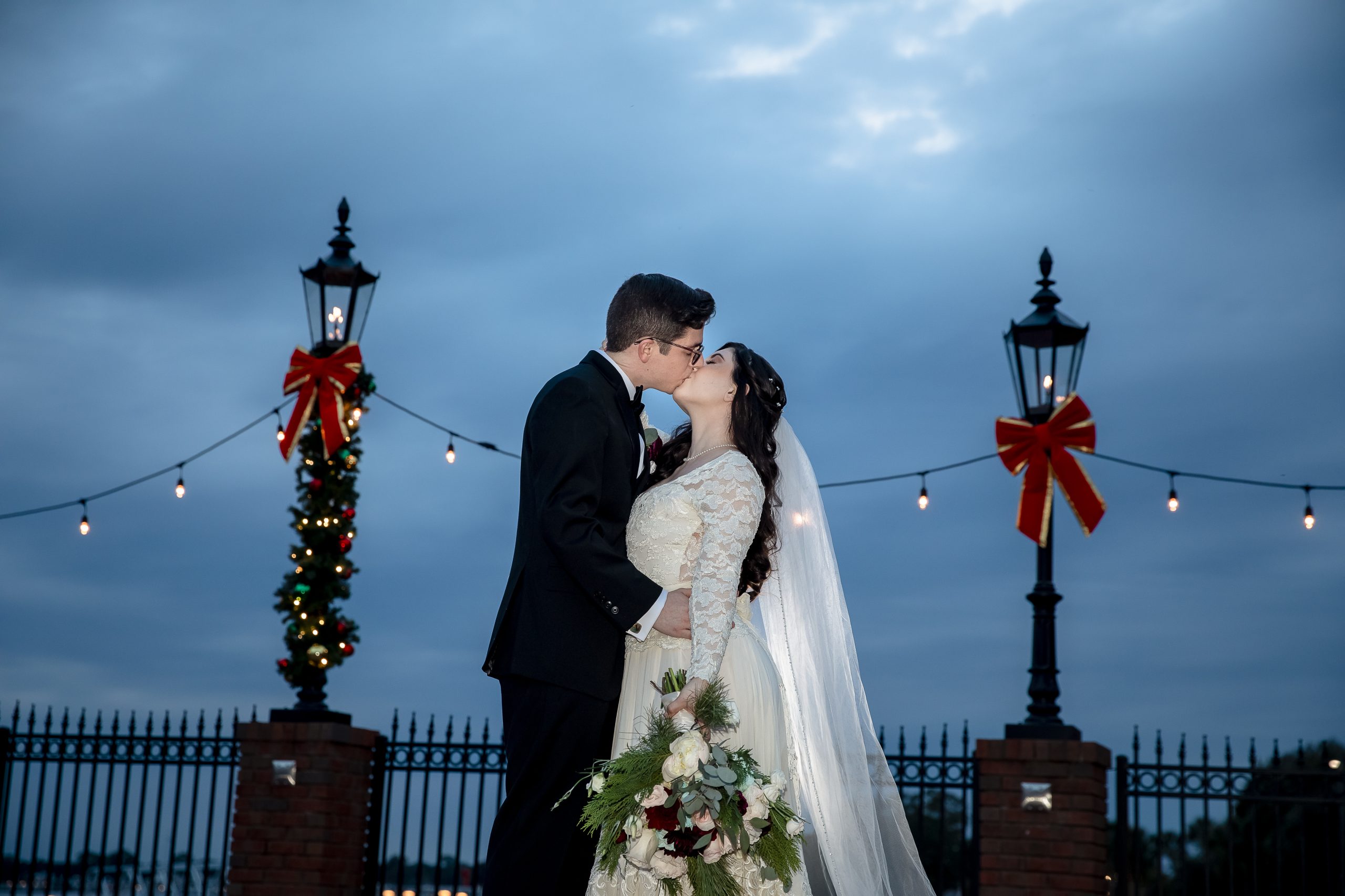 Calling all Christmas-loving couples! This Christmas wedding story is for you! One of our beautiful John Michael Events’ couples, Morgan and Max, had a Christmas wedding at Tavares Pavilion on the Lake. Filled with gorgeous burgundy details and plenty of Christmas cheer, their special day was inspired by the festive spirit of the holiday season. It had everything a Christmas wedding should have, from lush Christmas trees to romantic twinkle lighting to delicious food!