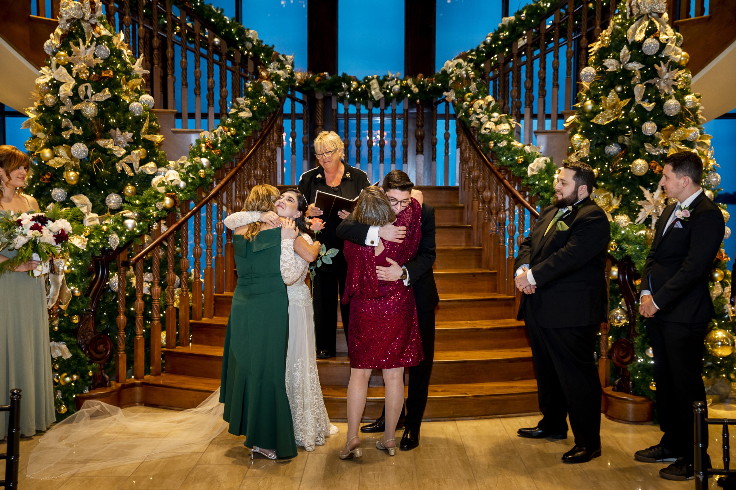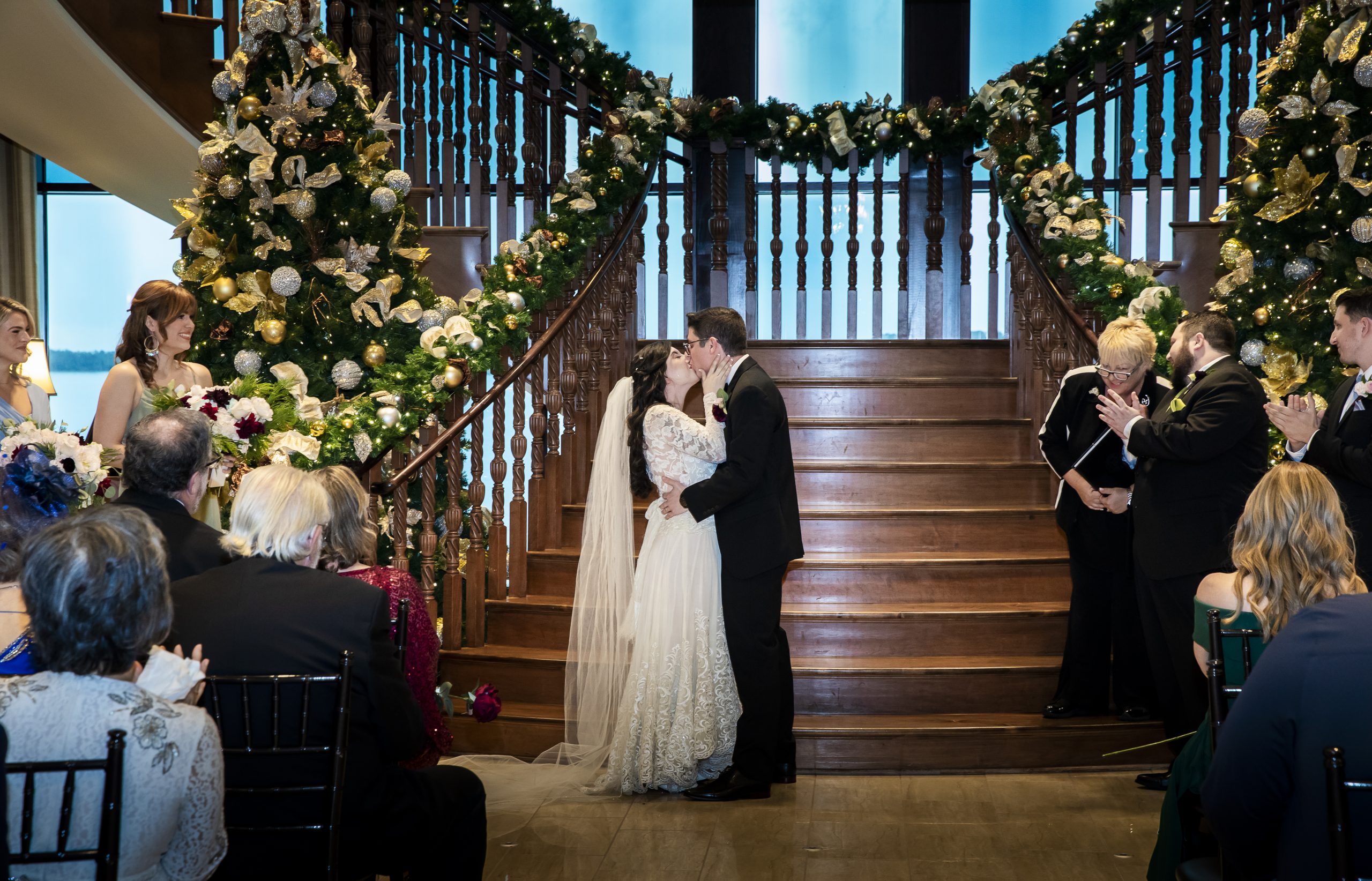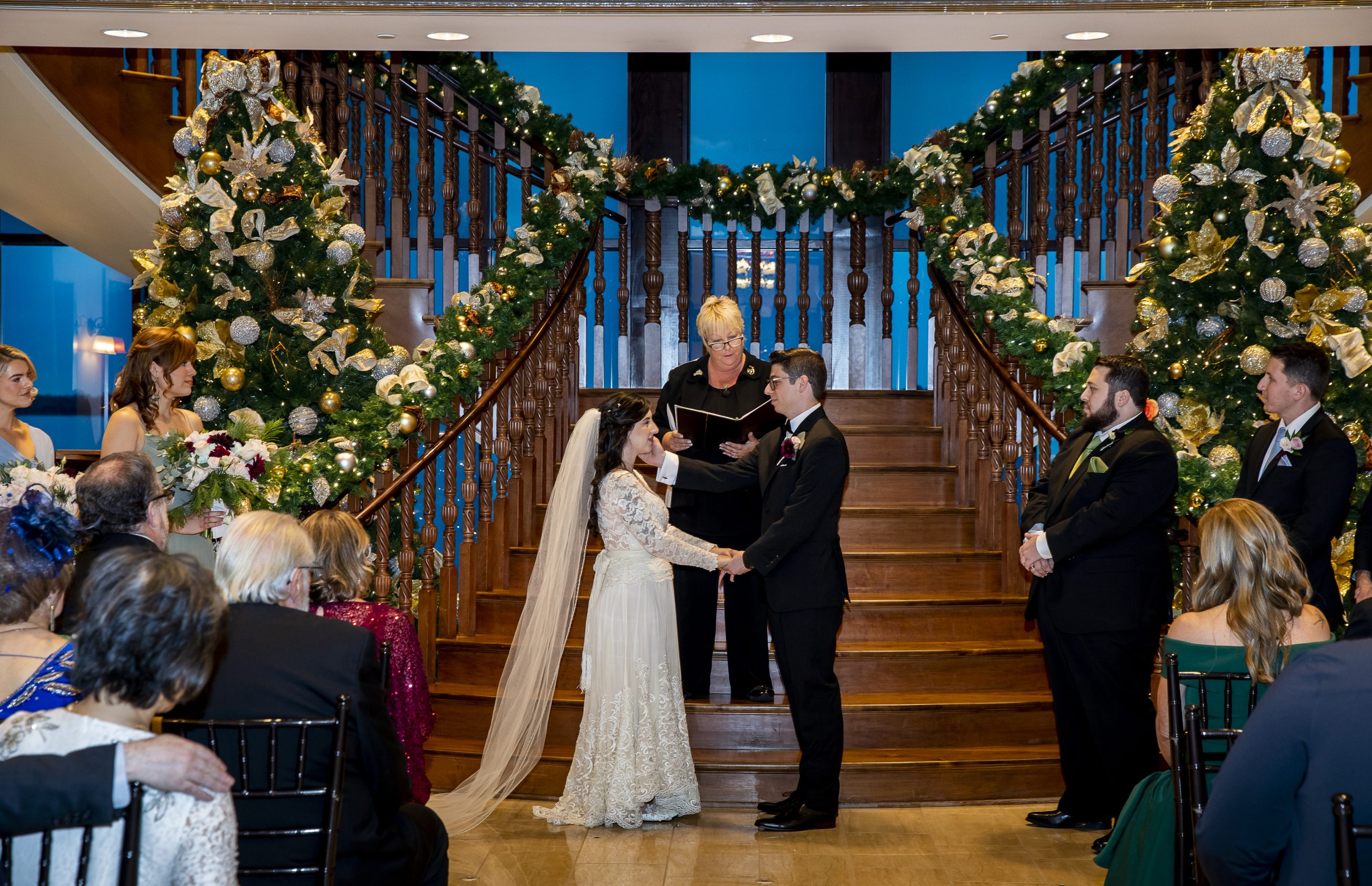 She met Max at the altar, which was decorated with immaculate Christmas garlands lining the banisters of the wooden staircase. They had metallic baubles and white twinkle lighting, setting a romantic atmosphere for their ceremony. Two Christmas trees also flanked either side of the altar, dressed in gold and silver ribbons and ornaments. It couldn’t have been more perfect for a Christmas wedding!