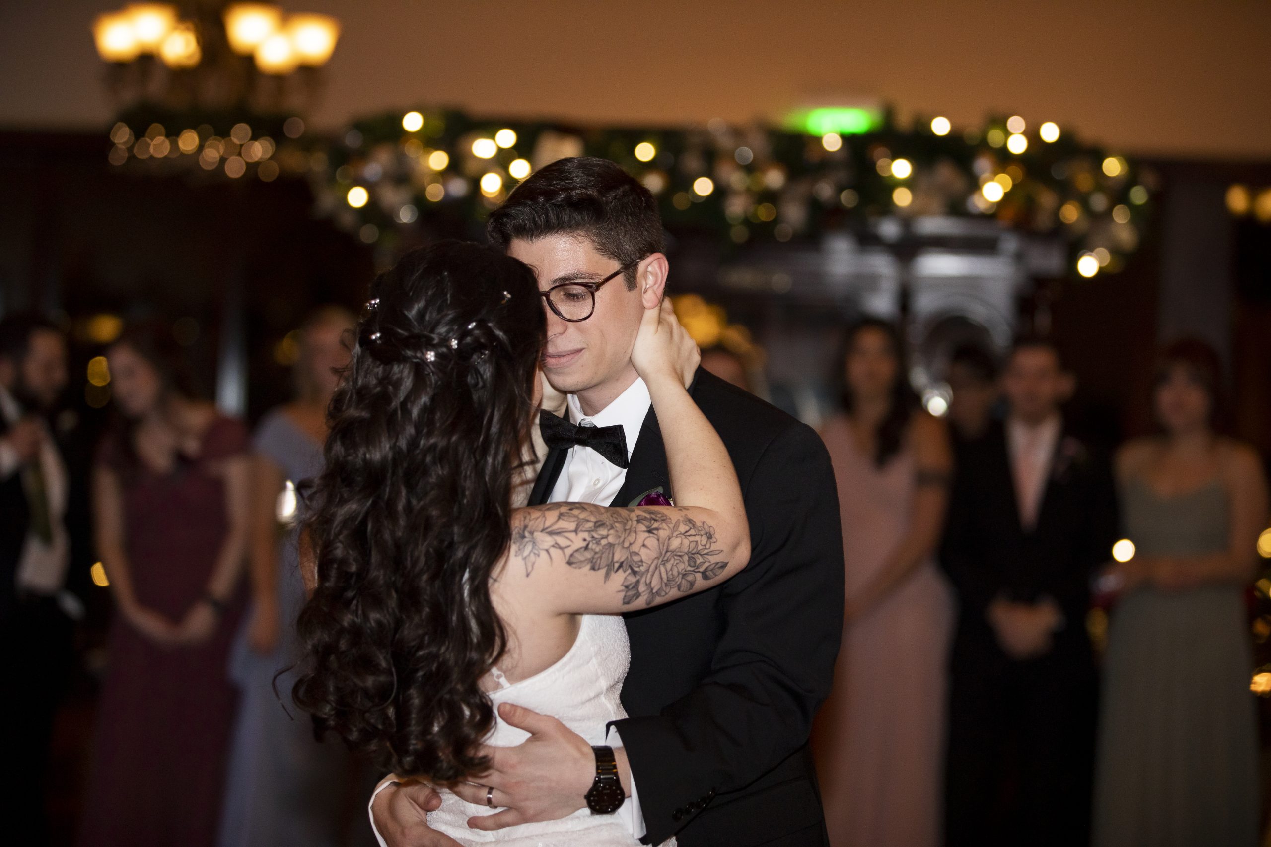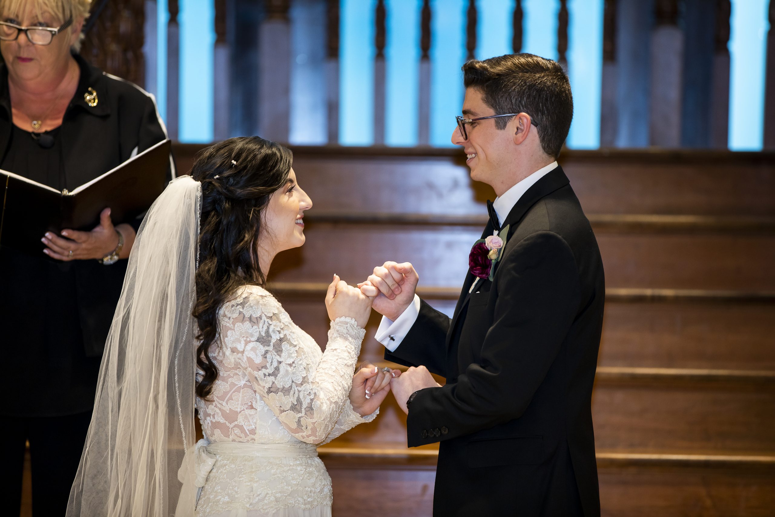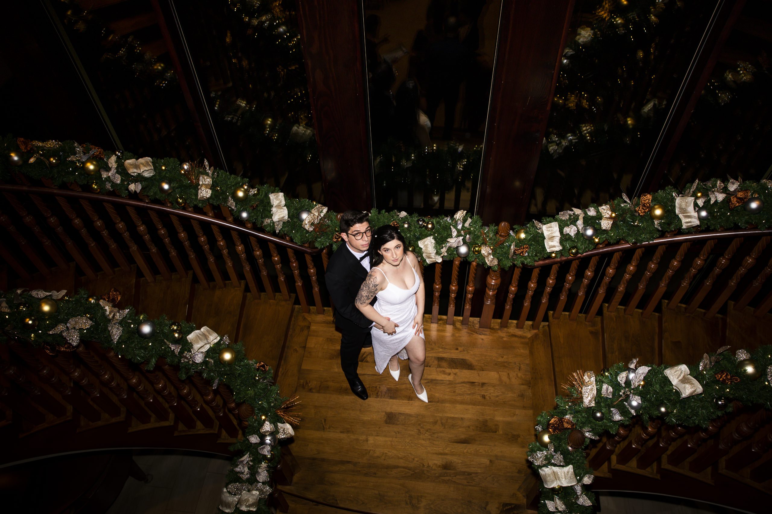 She met Max at the altar, which was decorated with immaculate Christmas garlands lining the banisters of the wooden staircase. They had metallic baubles and white twinkle lighting, setting a romantic atmosphere for their ceremony. Two Christmas trees also flanked either side of the altar, dressed in gold and silver ribbons and ornaments. It couldn’t have been more perfect for a Christmas wedding!