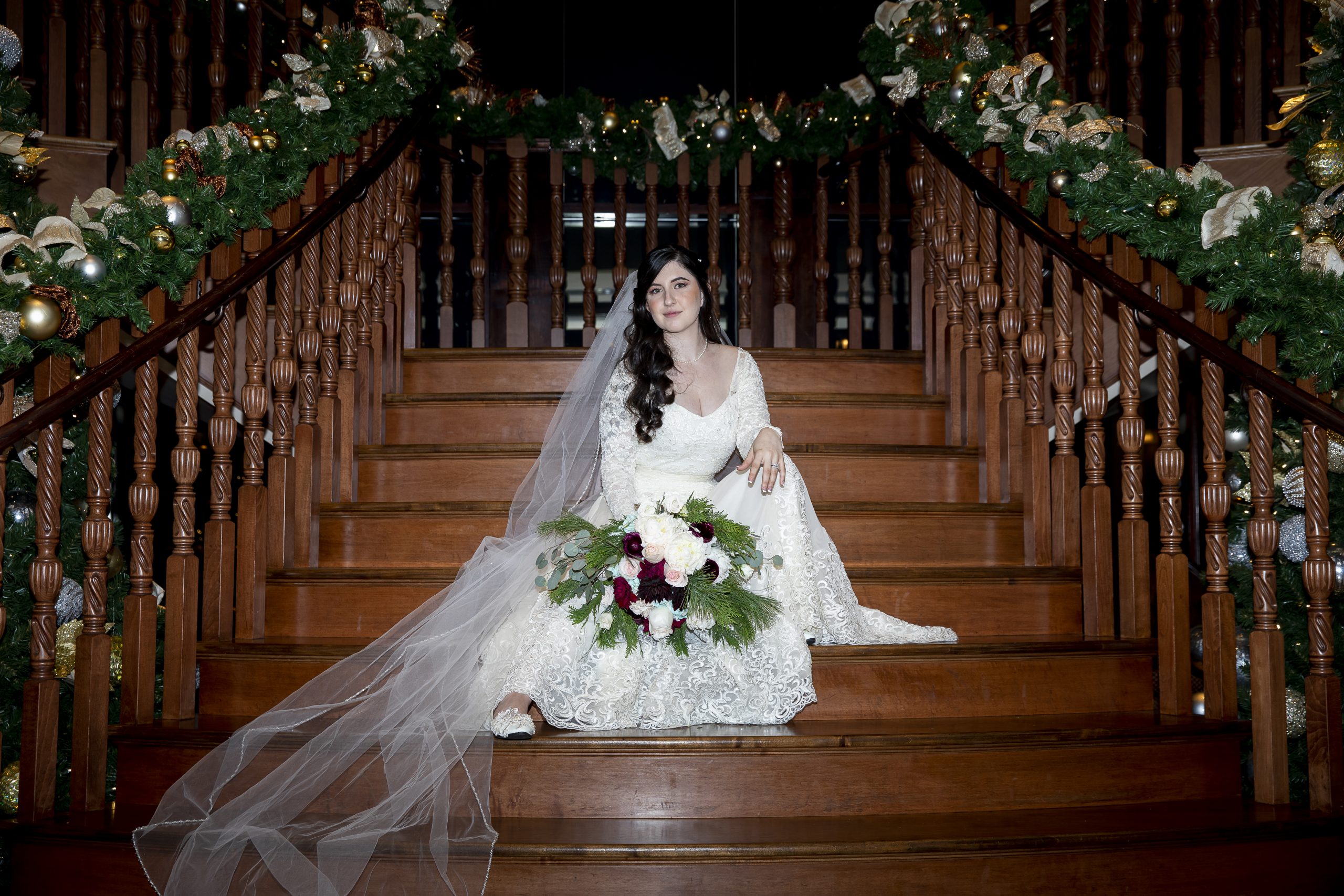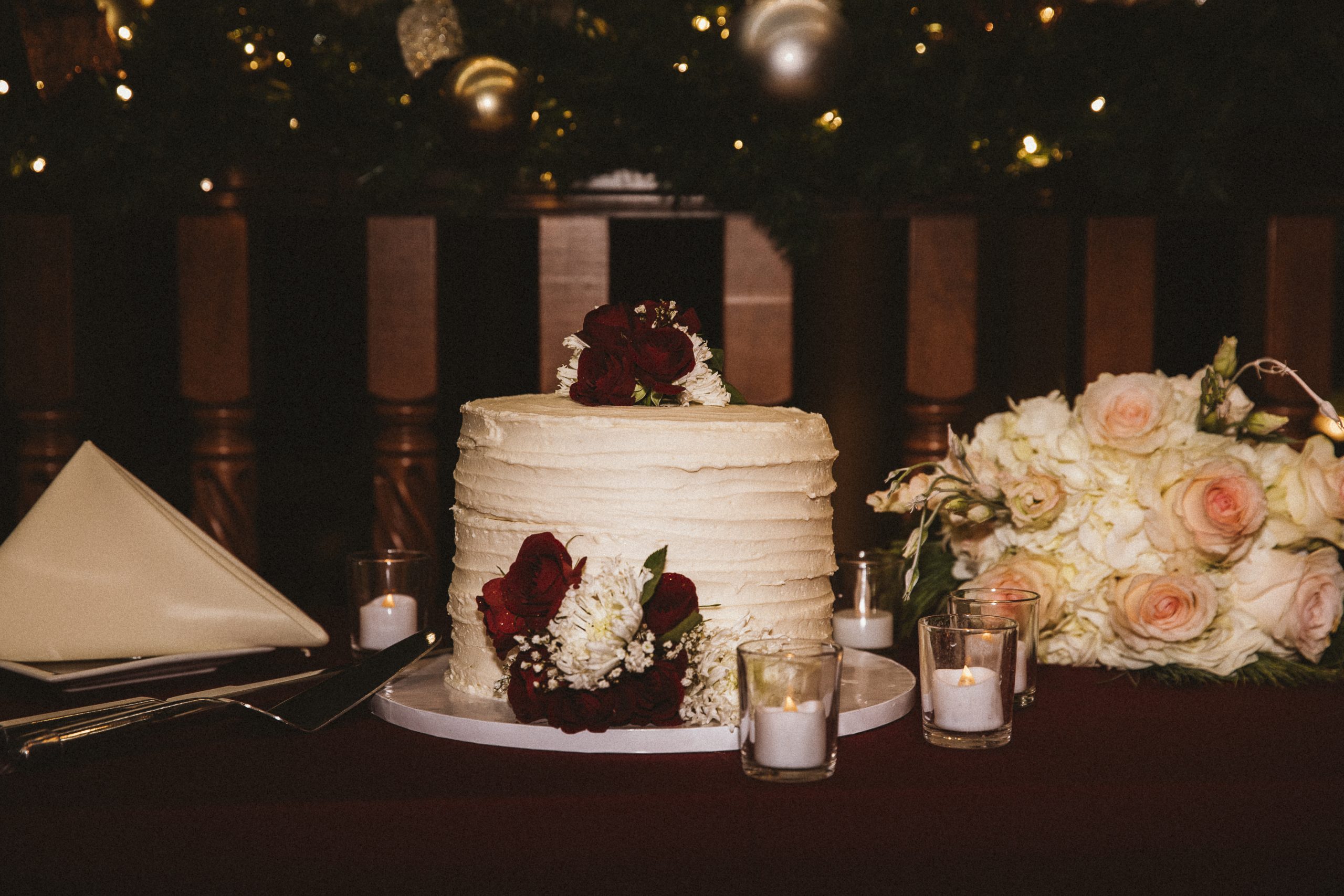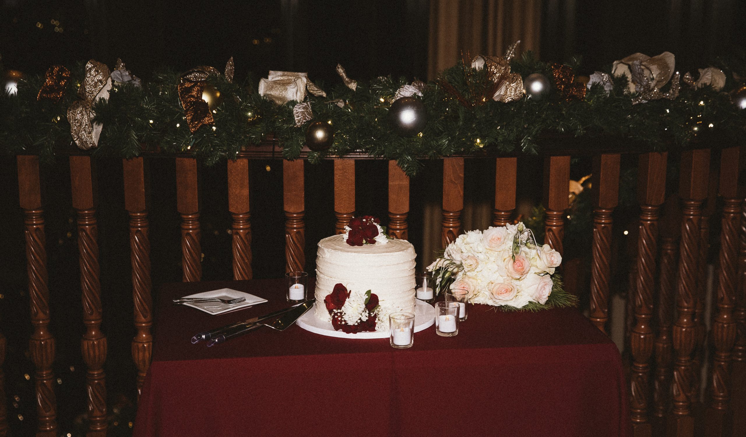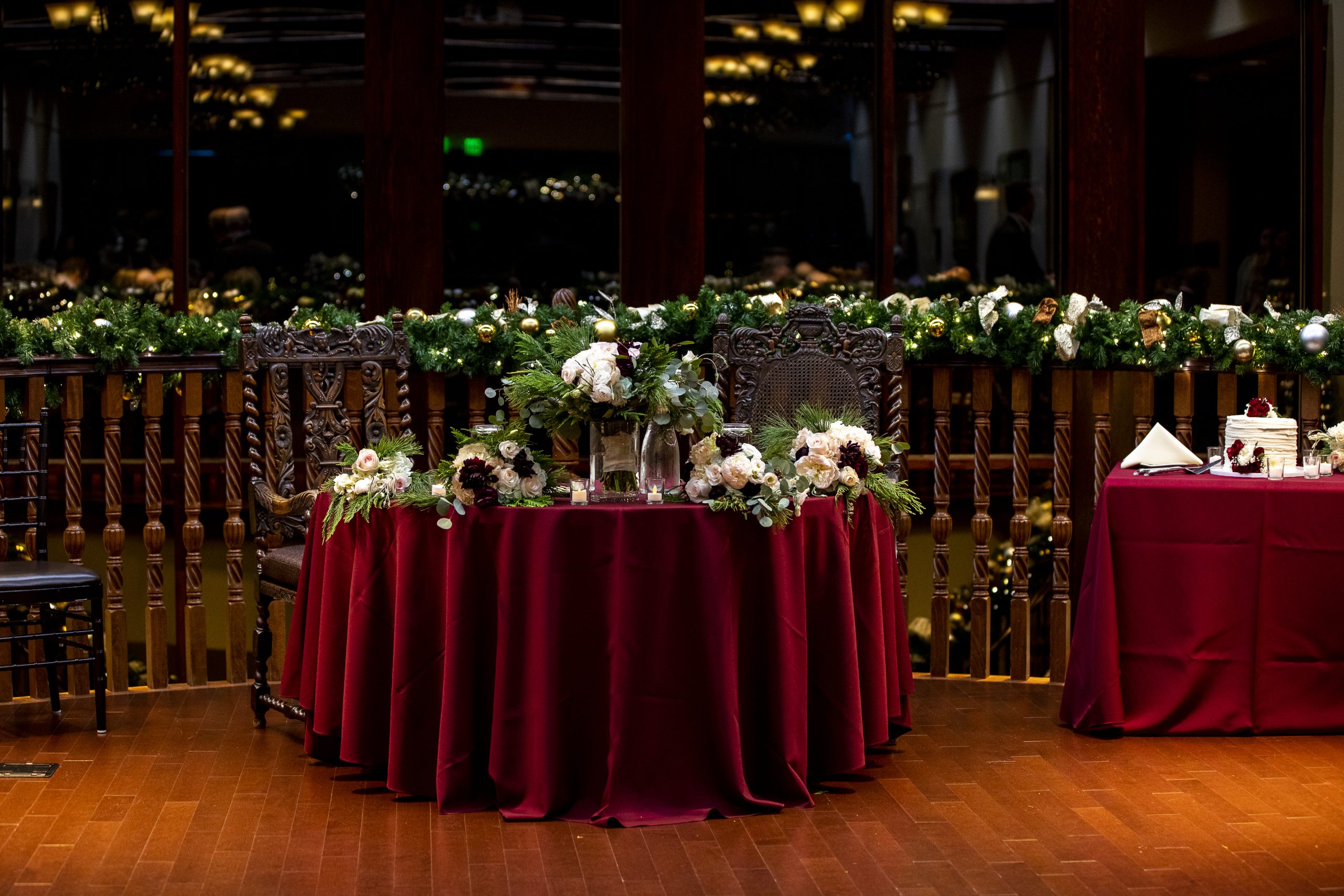 This Christmas wedding reception was picture-perfect! With mahogany Chiavari chairs, burgundy linens, garlands lining the staircase and wreaths hanging from each individual chandelier, this was the epitome of a Christmas wedding. The ambiance was joyous and romantic, as an amber glow filled the space from the various candles and Christmas fairy lights.