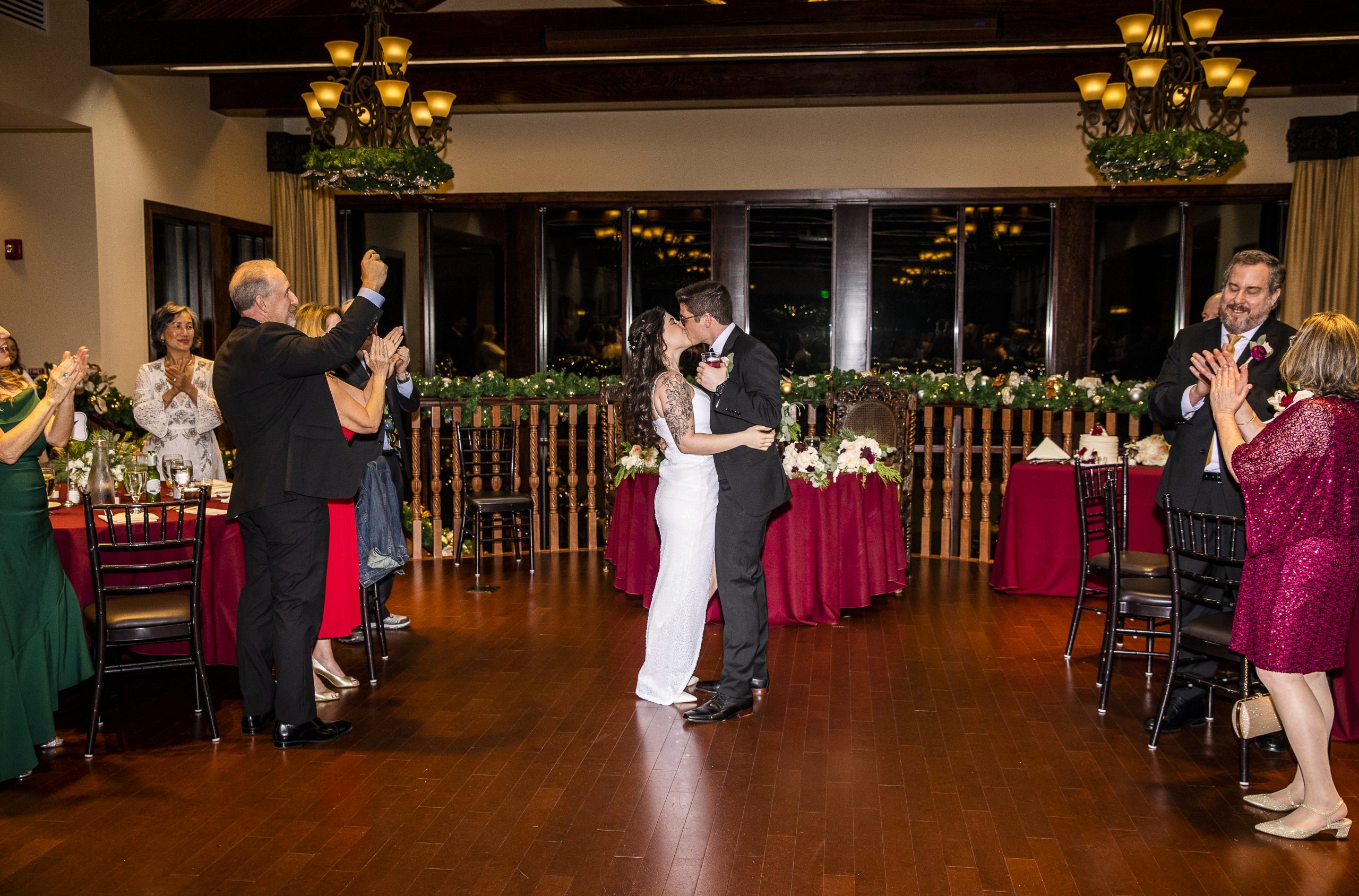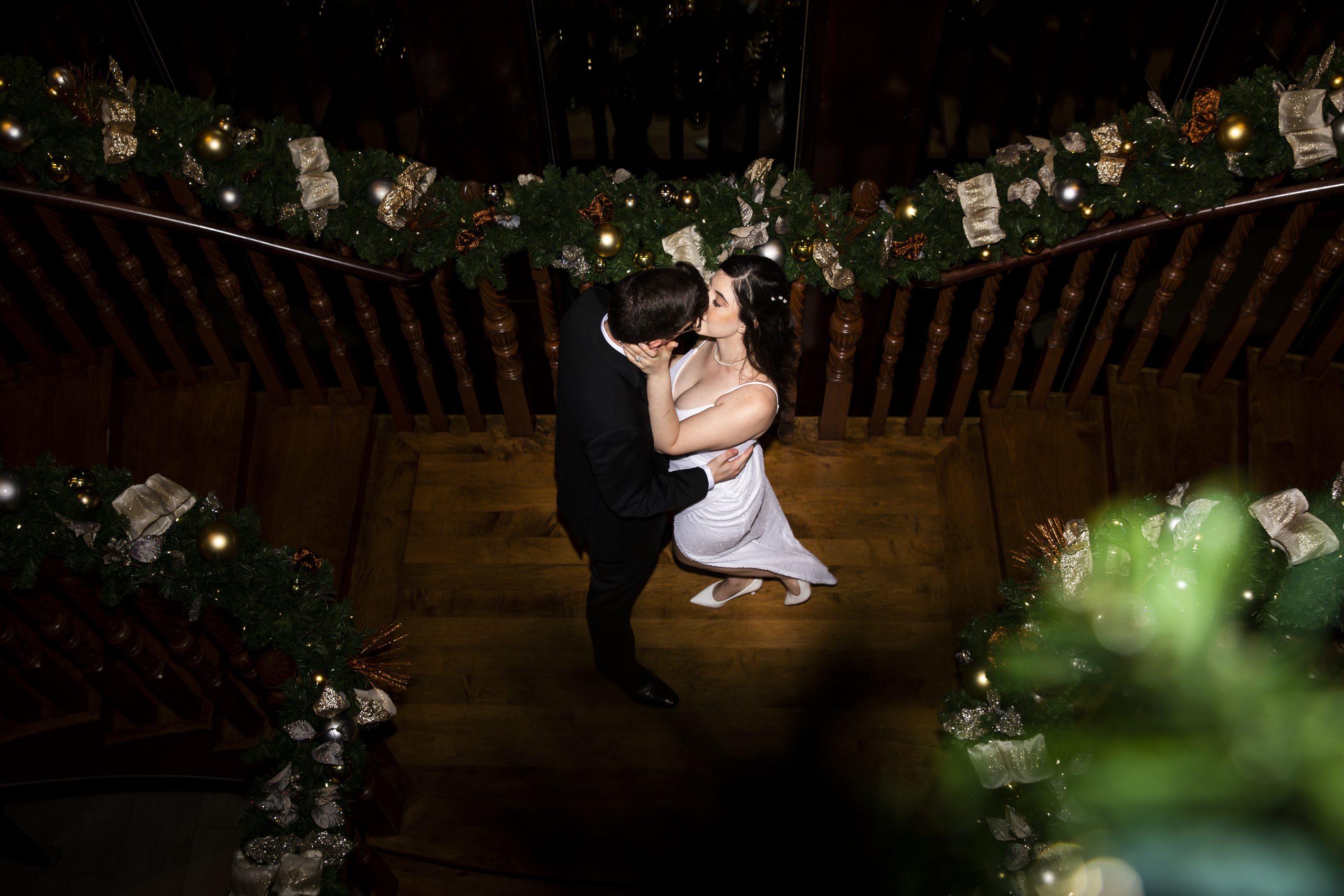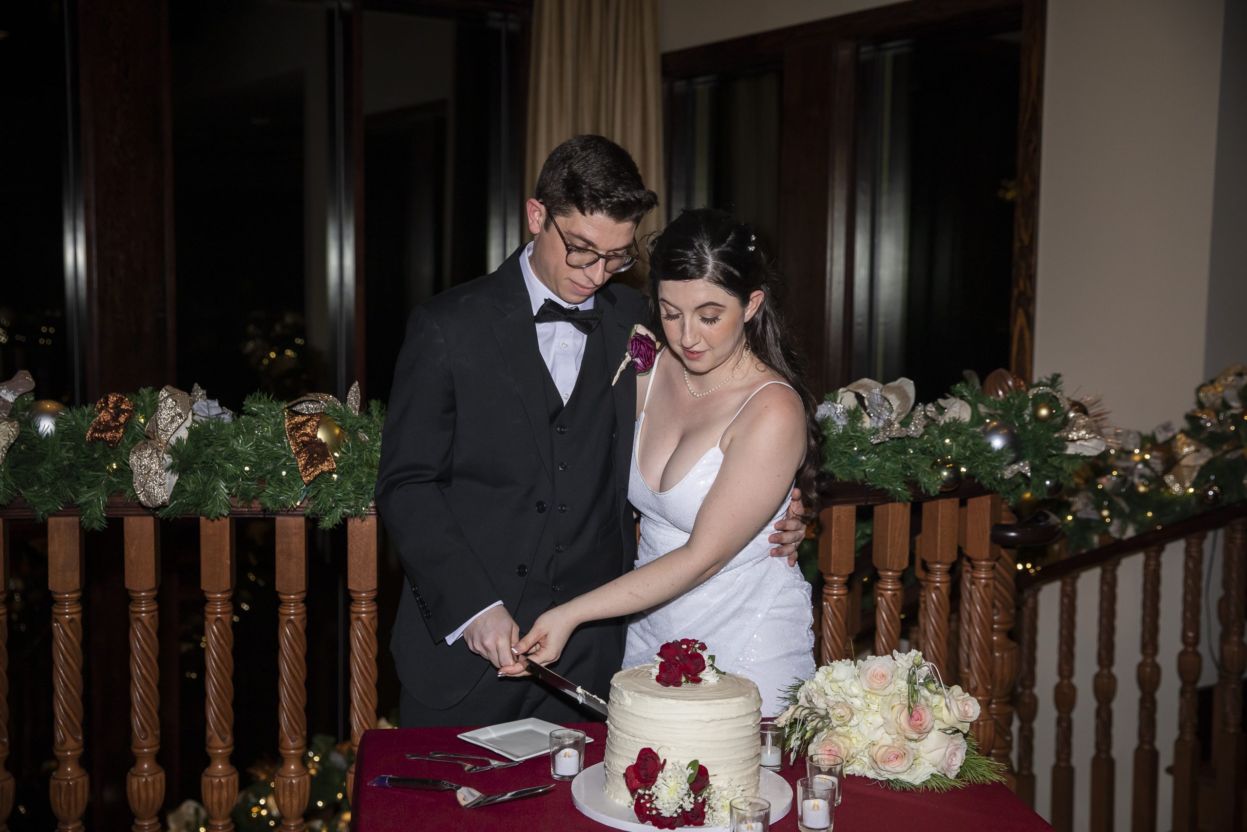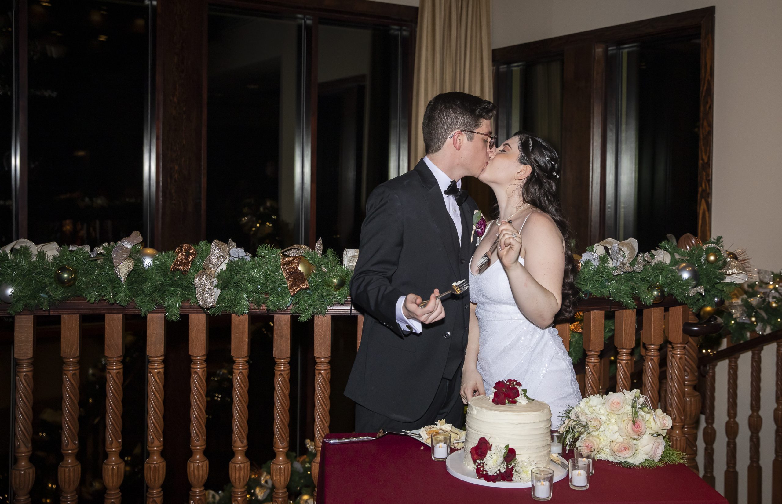 This Christmas wedding reception was picture-perfect! With mahogany Chiavari chairs, burgundy linens, garlands lining the staircase and wreaths hanging from each individual chandelier, this was the epitome of a Christmas wedding. The ambiance was joyous and romantic, as an amber glow filled the space from the various candles and Christmas fairy lights.