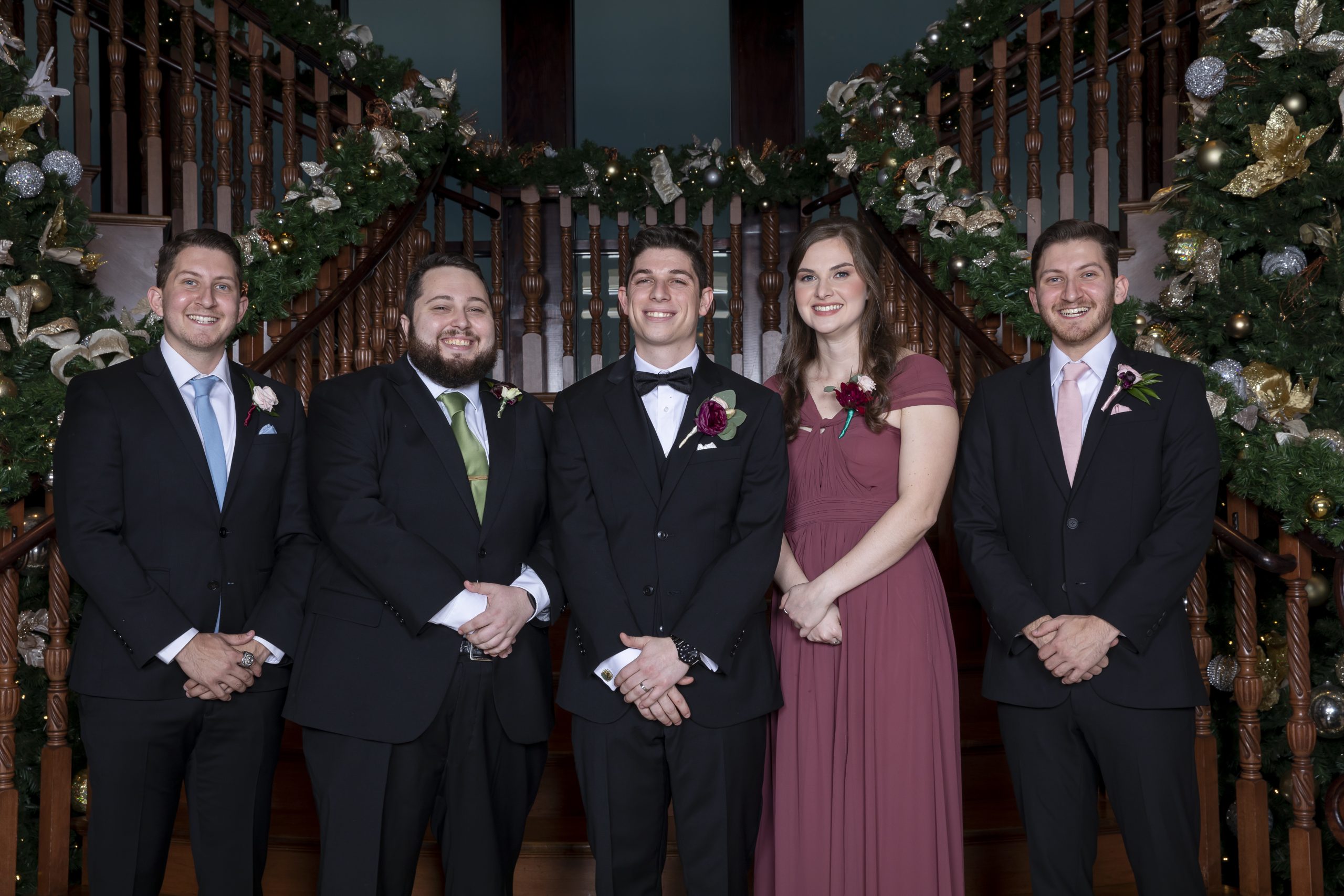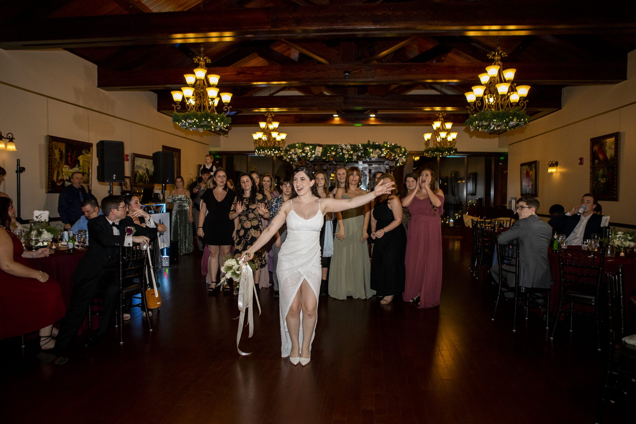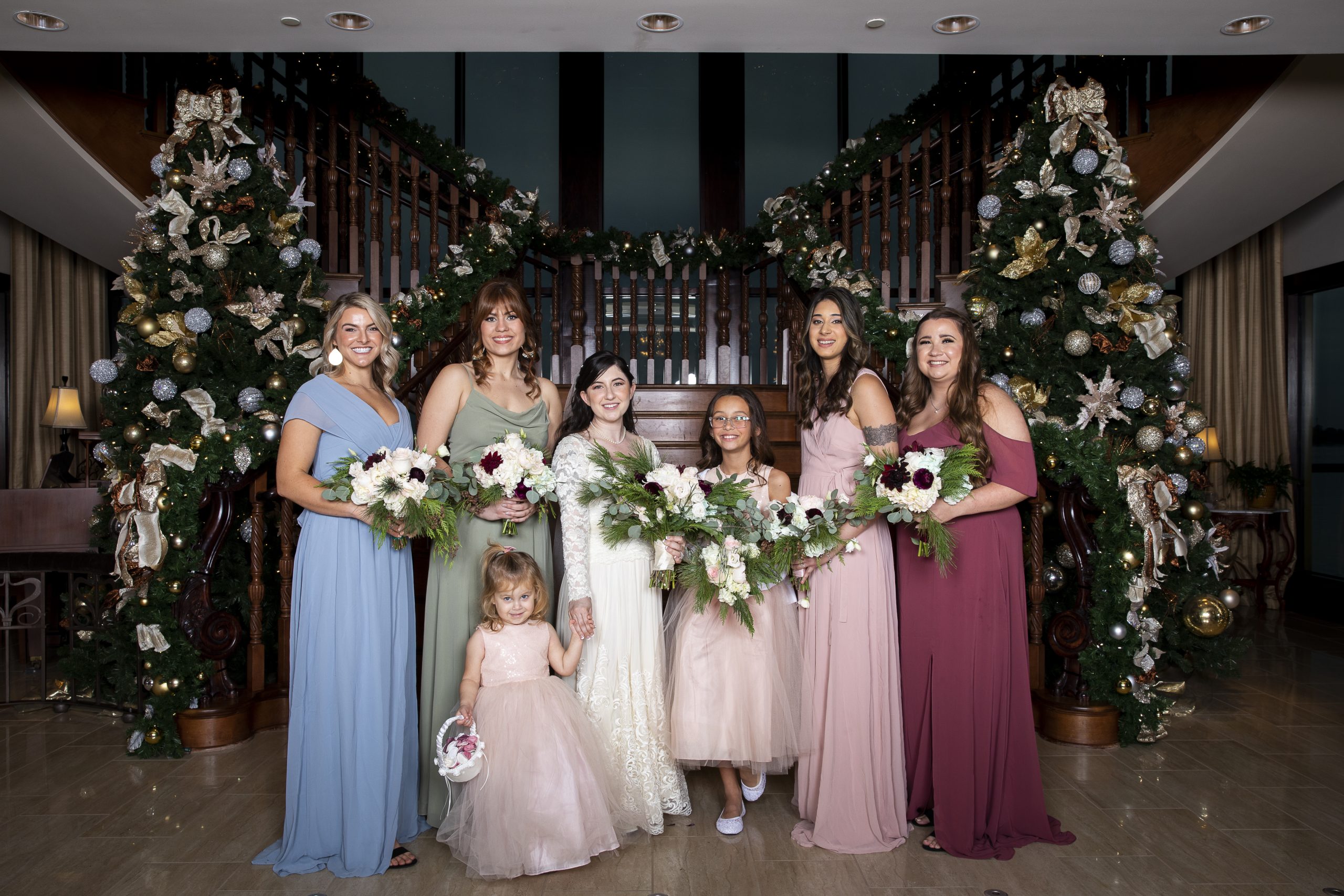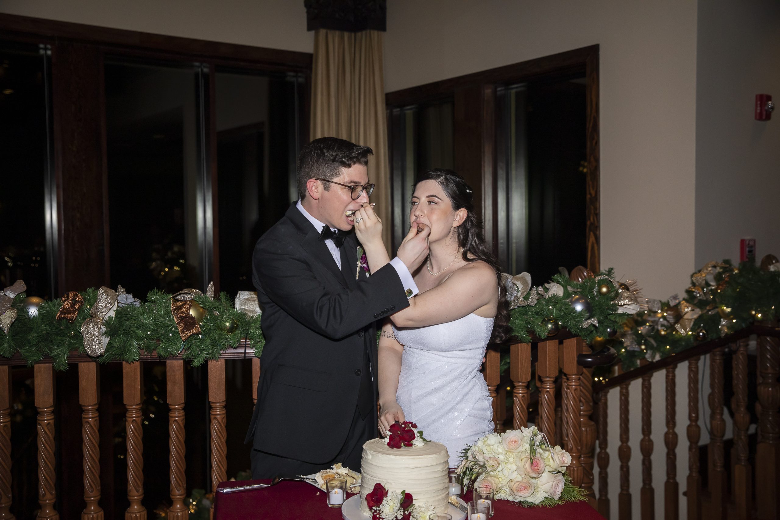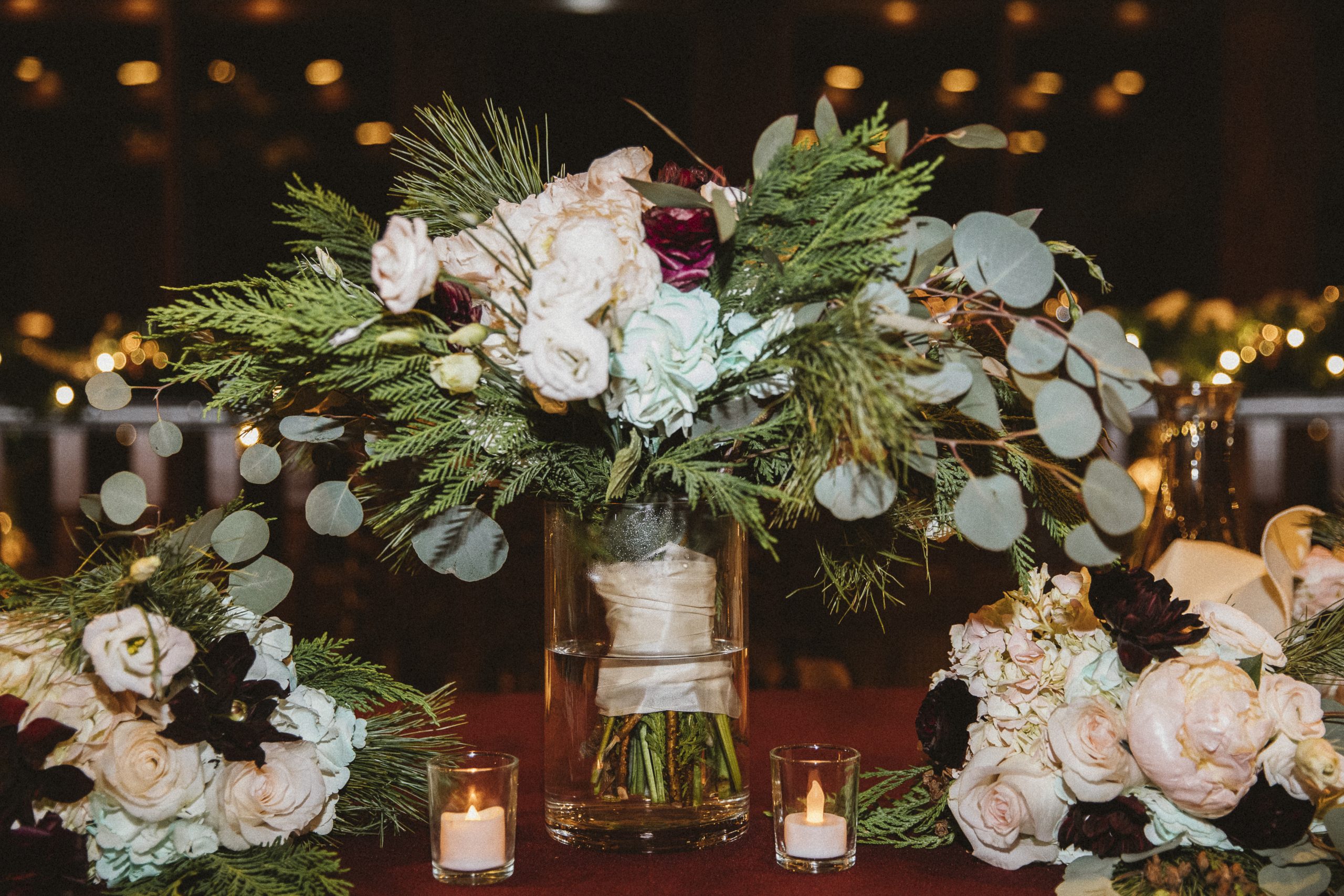 This Christmas wedding reception was picture-perfect! With mahogany Chiavari chairs, burgundy linens, garlands lining the staircase and wreaths hanging from each individual chandelier, this was the epitome of a Christmas wedding. The ambiance was joyous and romantic, as an amber glow filled the space from the various candles and Christmas fairy lights.