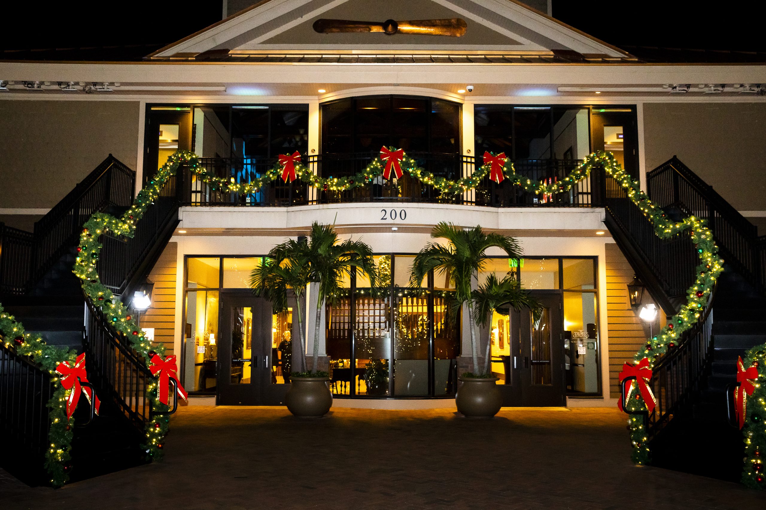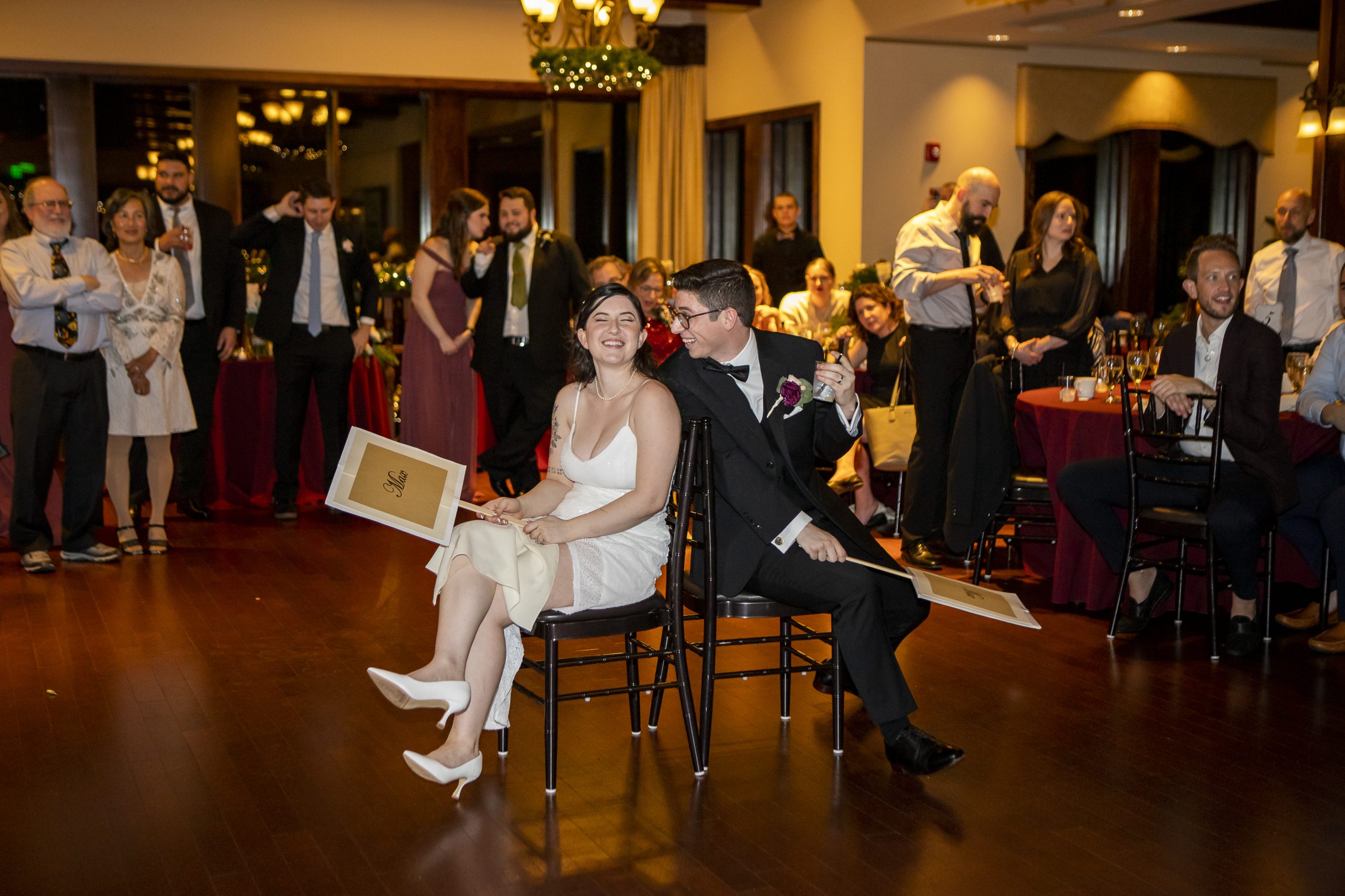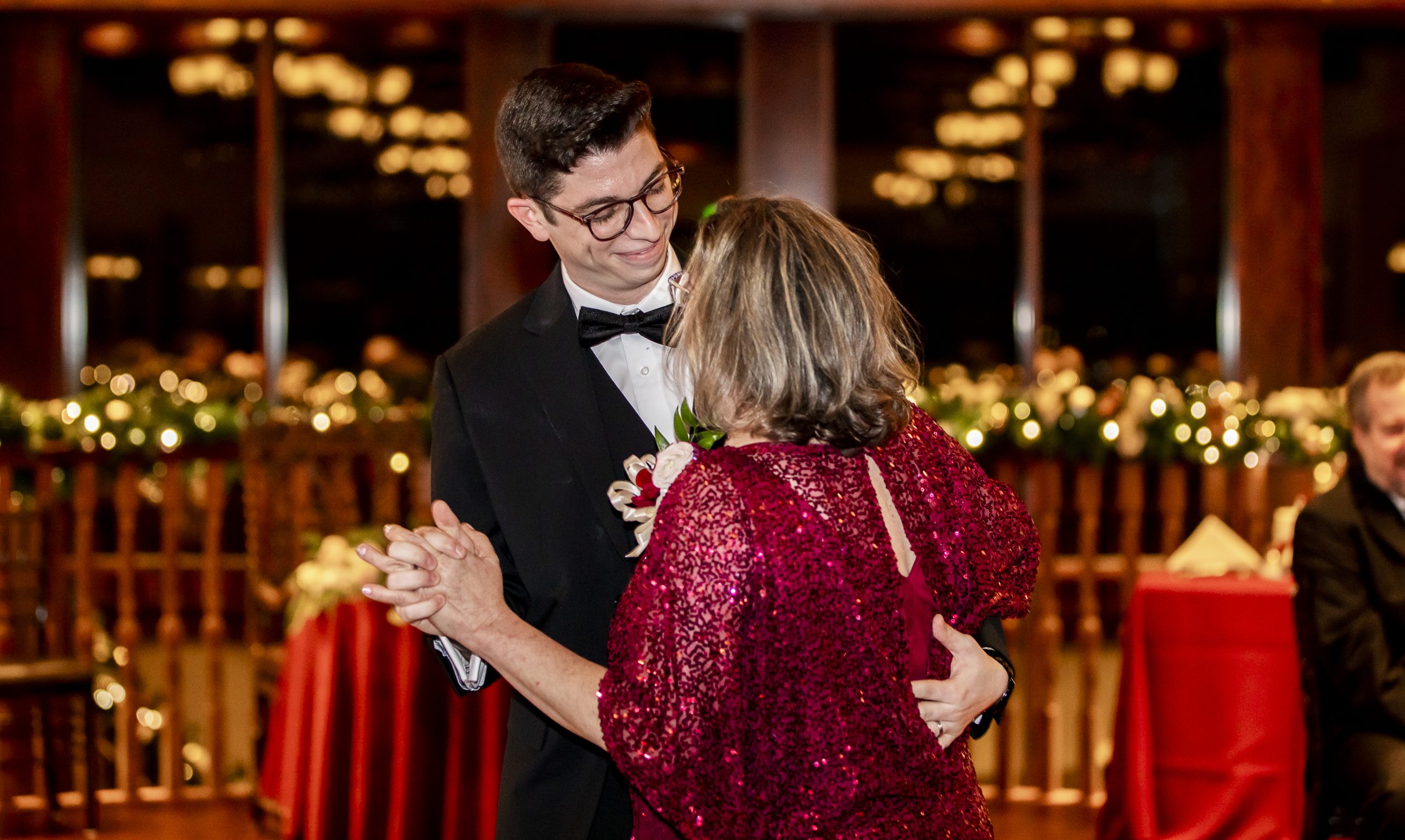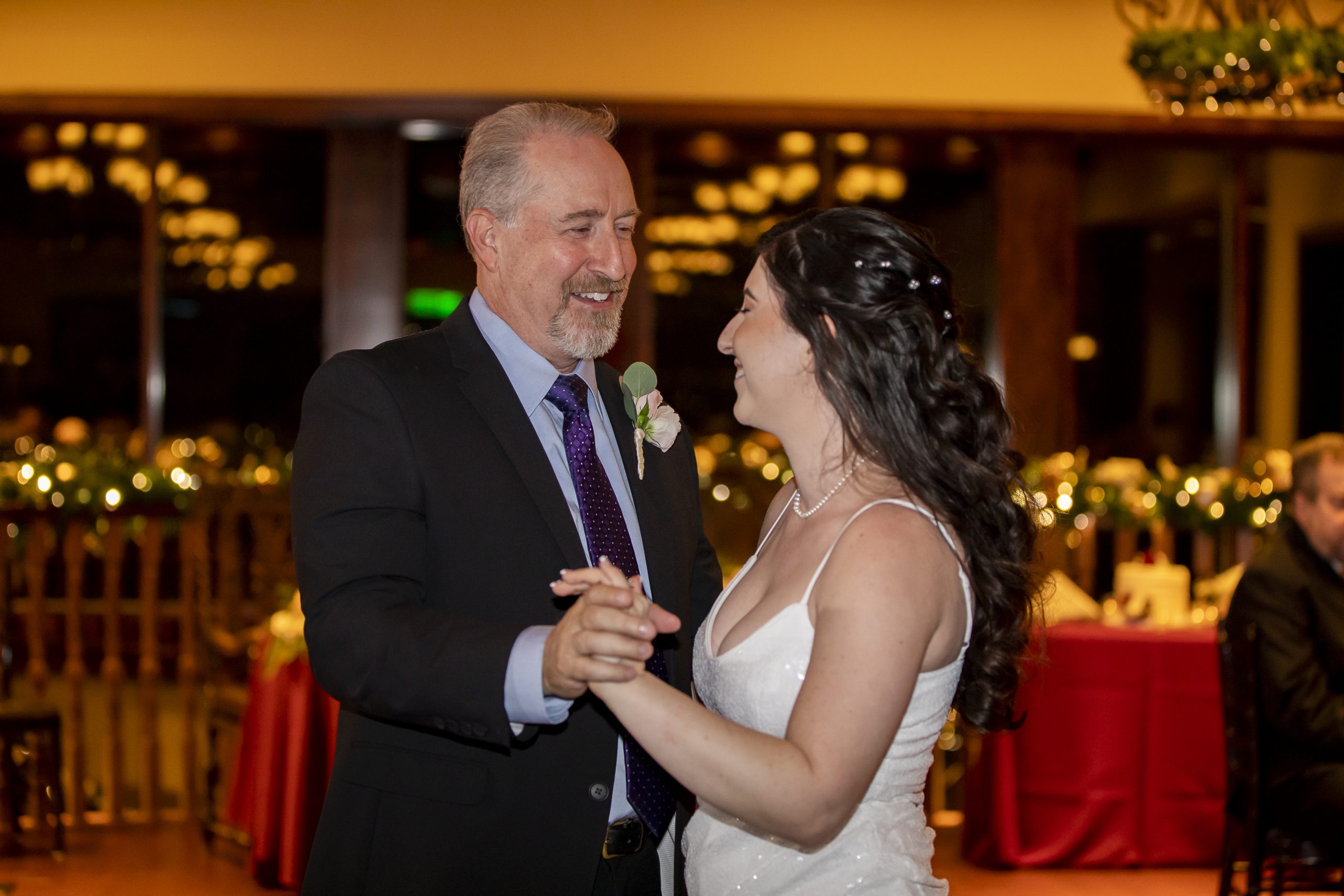 This Christmas wedding reception was picture-perfect! With mahogany Chiavari chairs, burgundy linens, garlands lining the staircase and wreaths hanging from each individual chandelier, this was the epitome of a Christmas wedding. The ambiance was joyous and romantic, as an amber glow filled the space from the various candles and Christmas fairy lights.