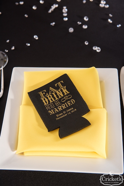 The reception that followed was summed up by the fun wedding favors they share with their guests. Each place setting was set with a beautiful sunflower yellow napkin and a beer koozie reading “Eat, Drink and Be Married”