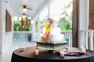 Dinner concluded with the couple cutting this beautiful three tier white quilted wedding cake, decorated with a cascade of colorful flowers.