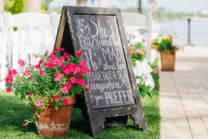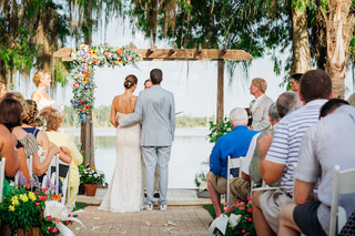 Their waterfront wedding ceremony was filled with beautiful details from the vintage chalkboard art signed inviting guests to find a seat, to the buckets of fresh flowers surrounding shelves of flower petals for guests to toss. The rustic wooden ceremony arbor was decorated with flowing greens and brightly colored flowers.