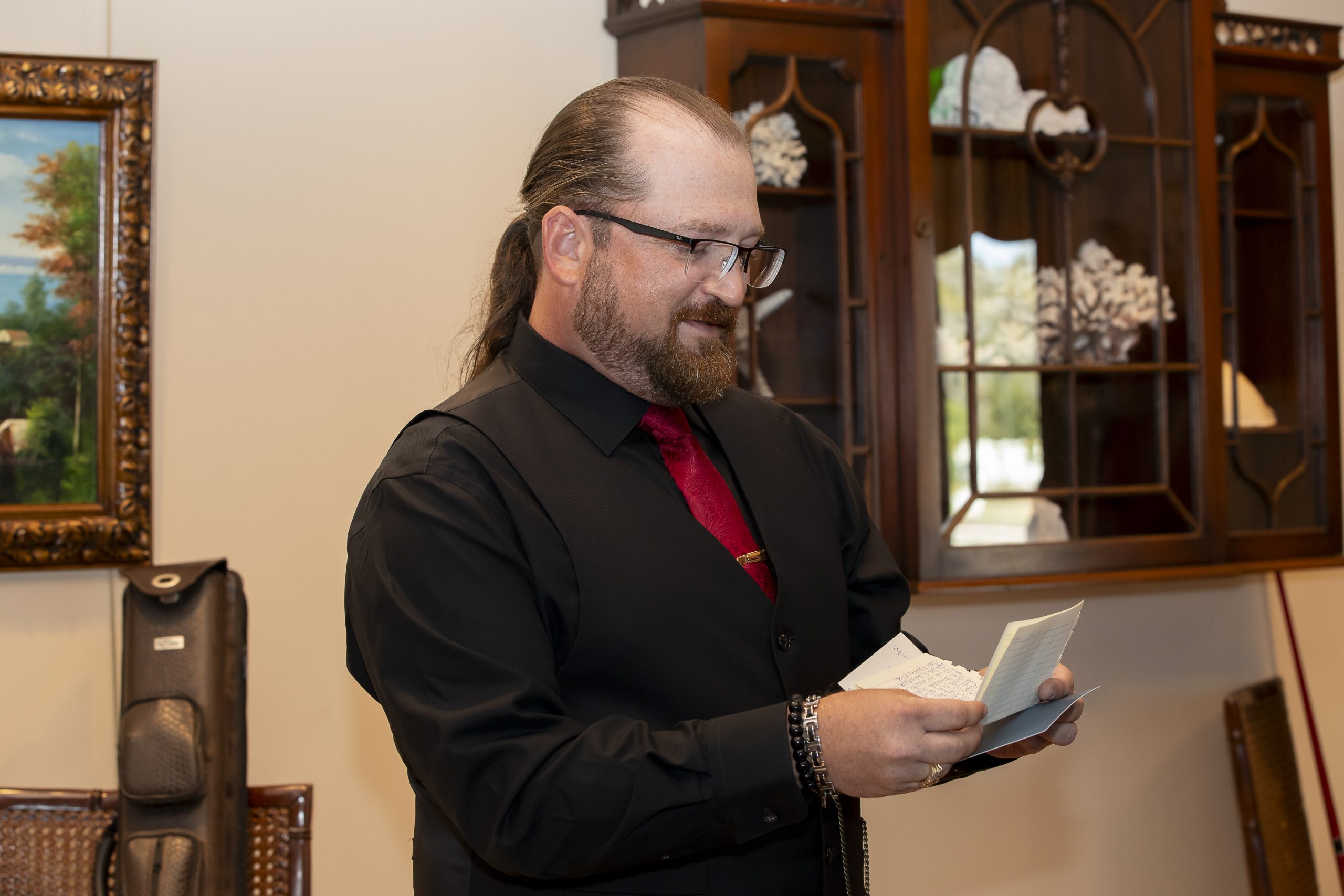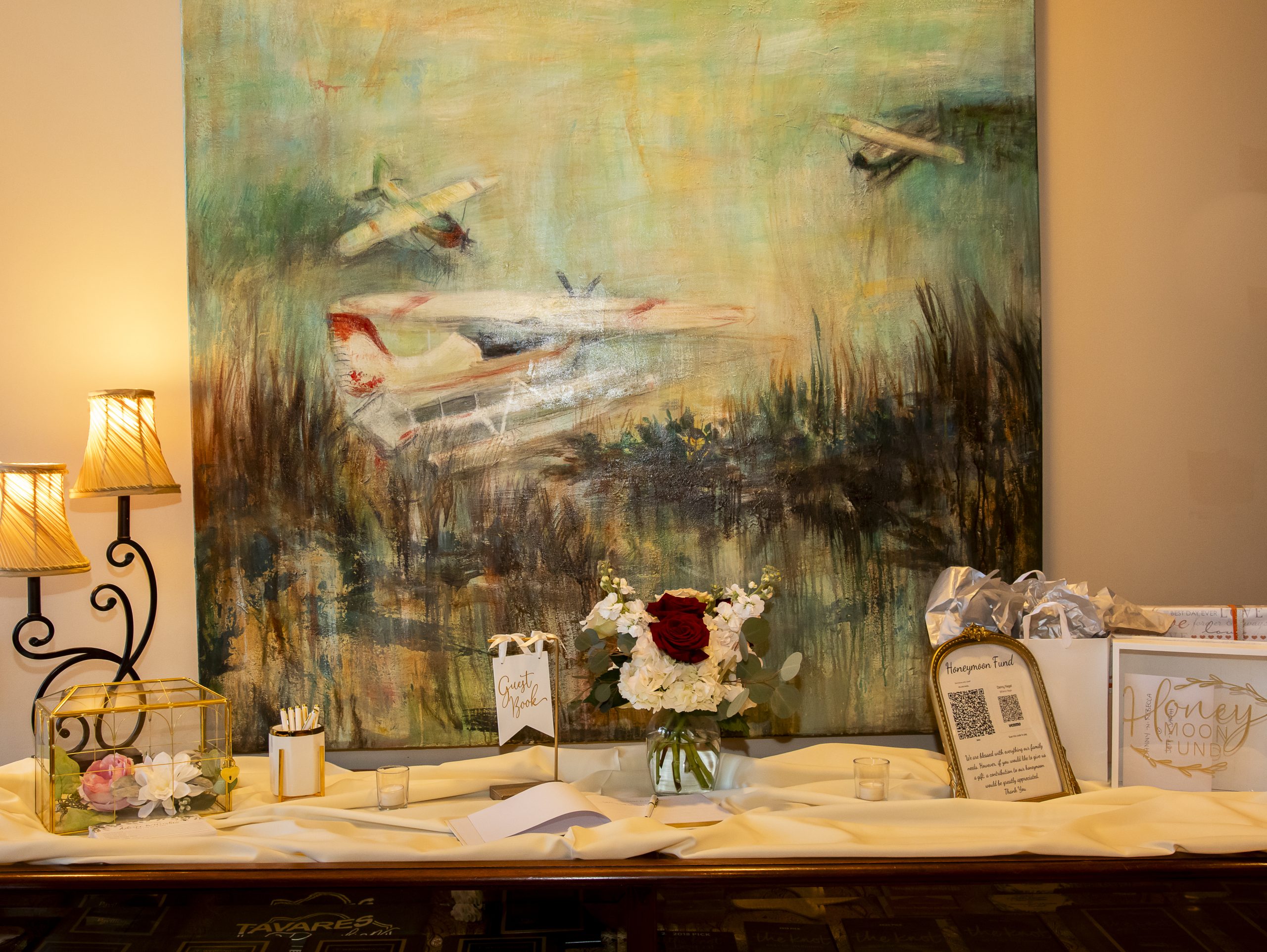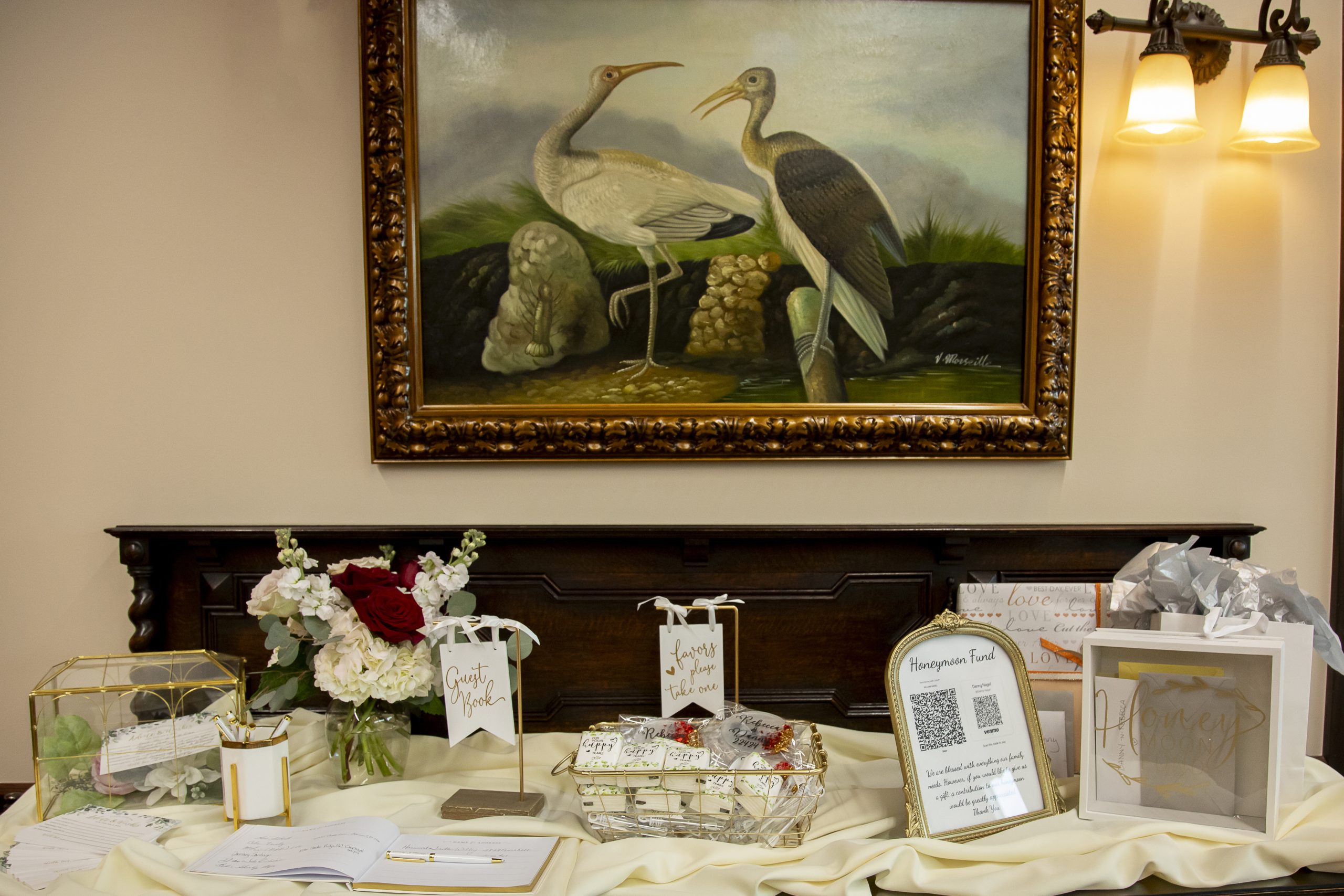 On Rebecca and William’s burgundy wedding day, our coordination team set up their personal décor in this ceremony space. We set “Reserved” signs on the first three rows of chairs, placed individual tissue packets on every seat, and set up the sand unity ceremony at the altar. We also made sure to set up this couple’s memorial display and guest book table.