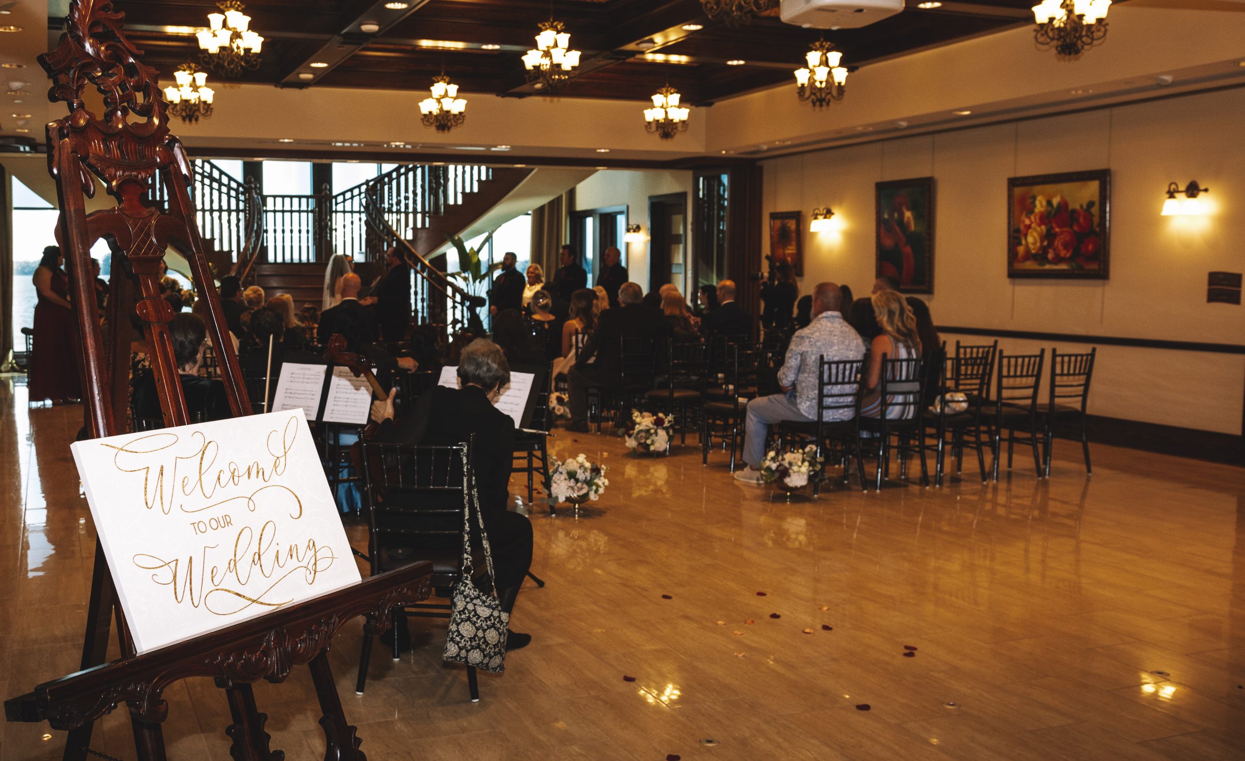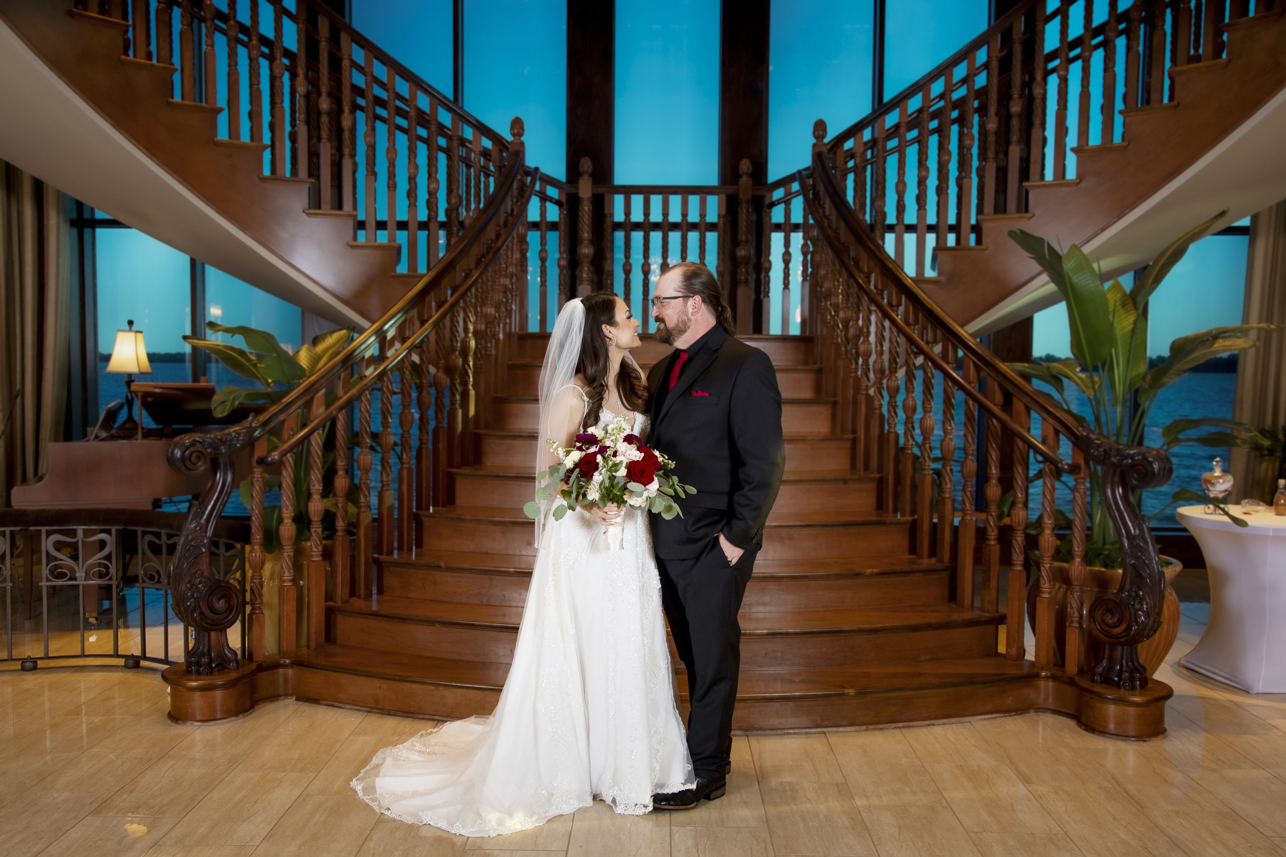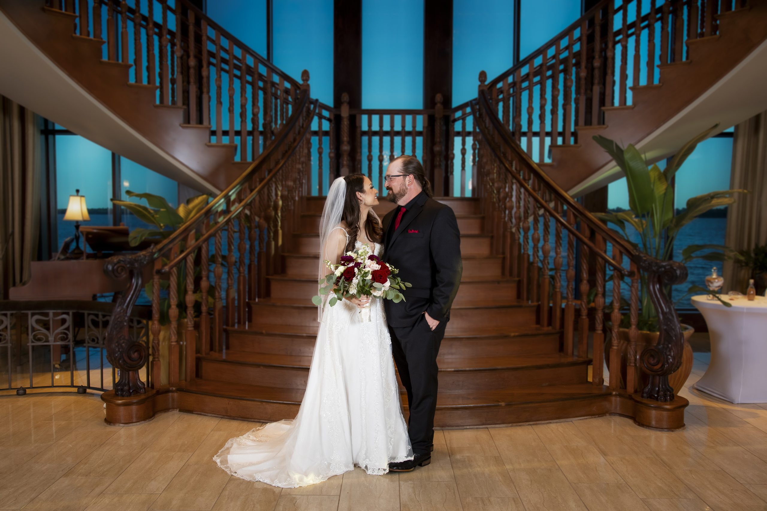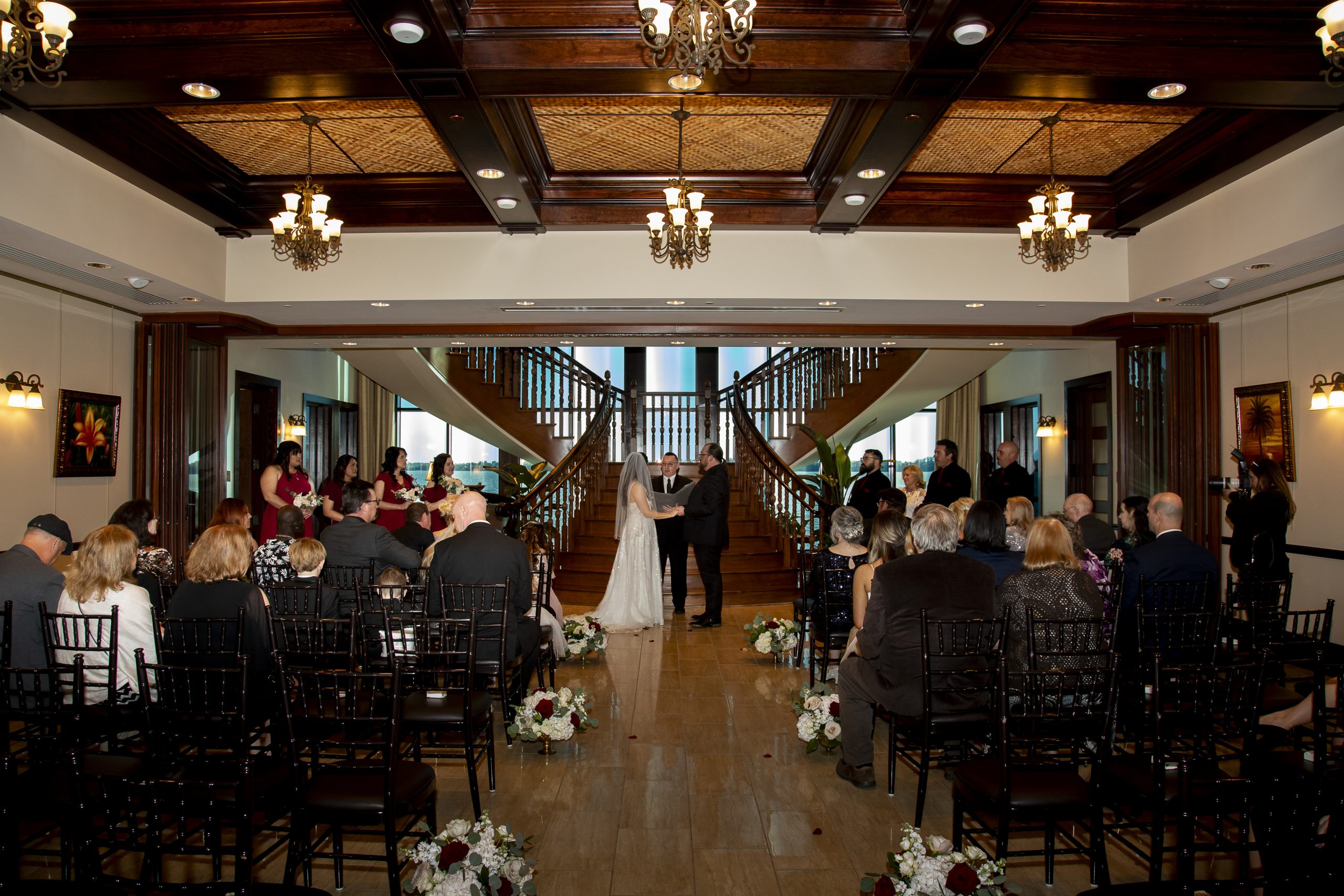 The Tavares Pavilion is one of our favorite Orlando wedding venues because of its gorgeous lakeside views and versatile event spaces. Their ceremony site features a gorgeous grand staircase, golden chandeliers, and floor-to-ceiling windows that allow for natural light to flood into the room.