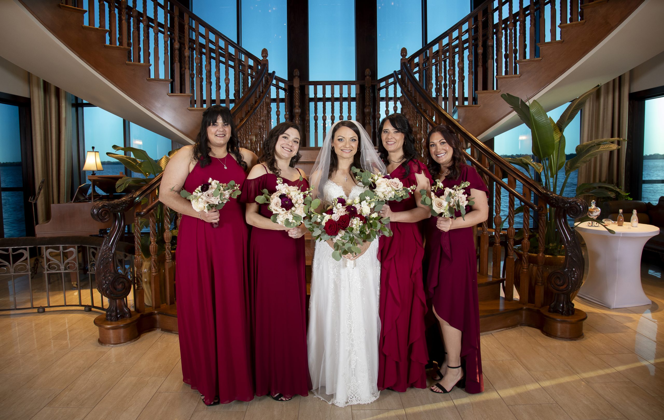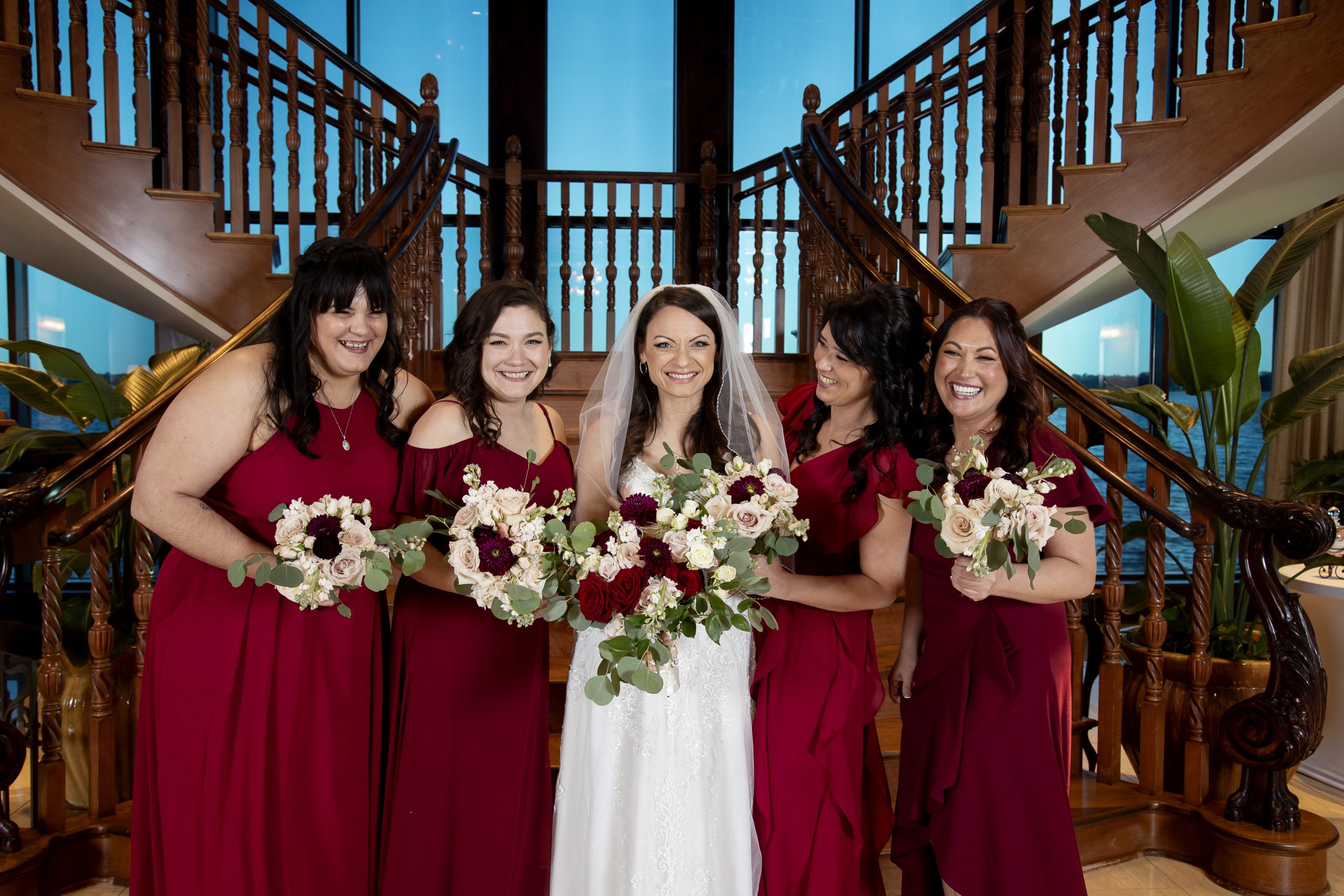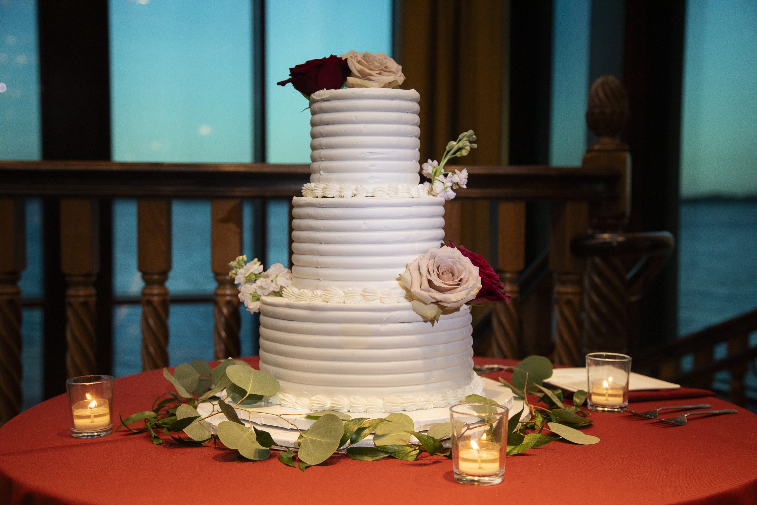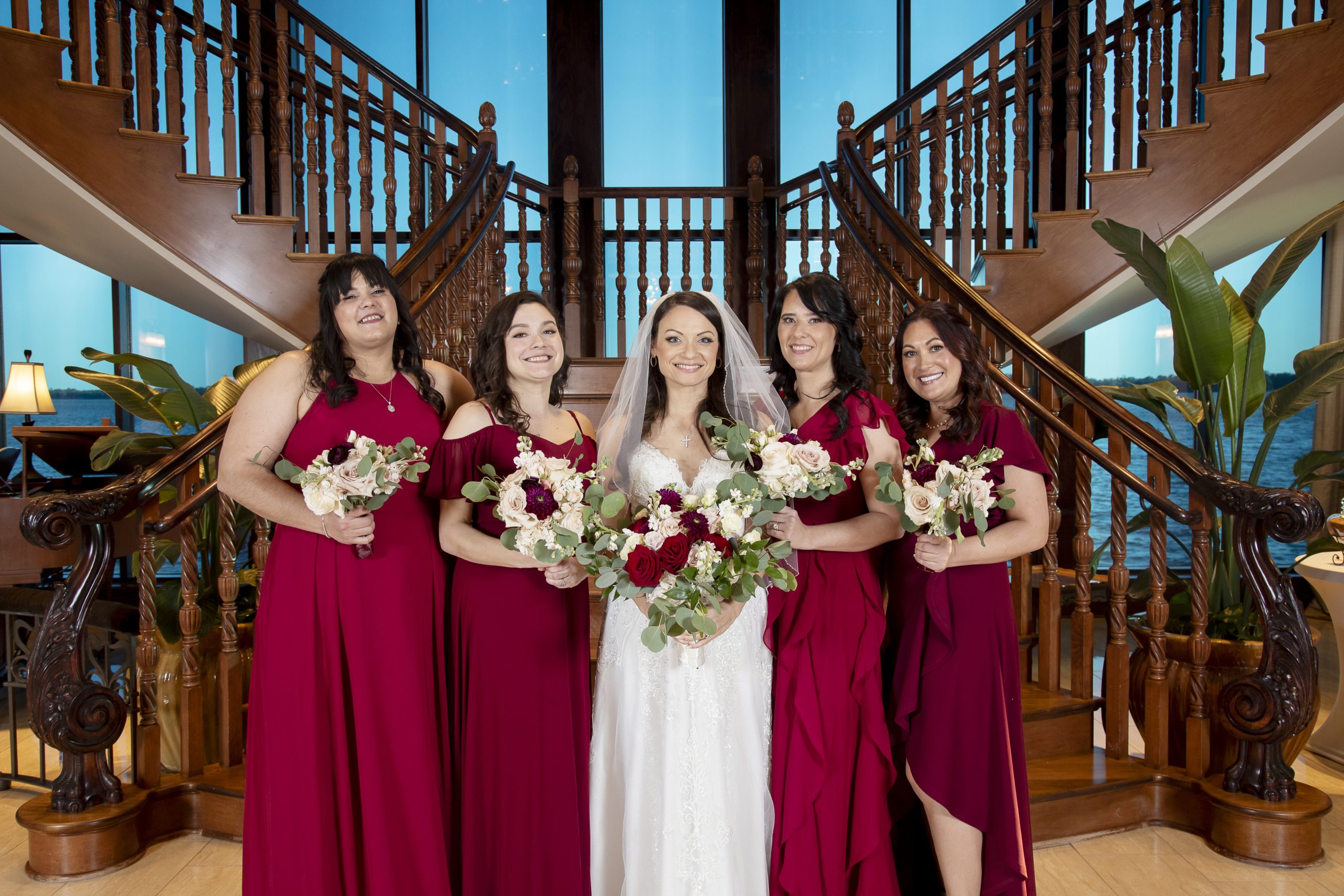 One of our wonderful couples, Rebecca and William, utilized one of our Diamond Package offerings to have a beautiful burgundy and ivory wedding at the Tavares Pavilion. Our Event Managers assisted them with booking their dream Orlando wedding vendors, helped plan their wedding timeline, and of course, carefully crafted a delicious wedding catering menu.
