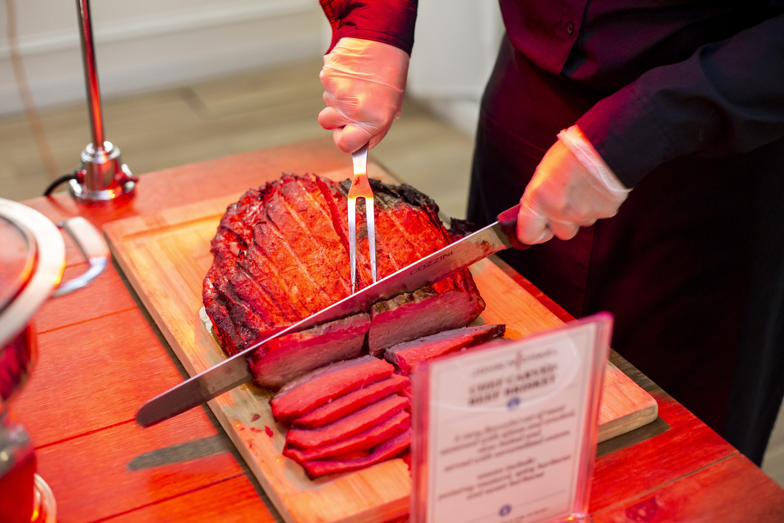 - Chef Carved Beef Brisket – A very flavorful cut of meat seasoned with spices and smoked, slow baked and served with caramelized onions. Served with an assortment of sauces including pomerey mustard, spicy barbecue, and sweet barbecue