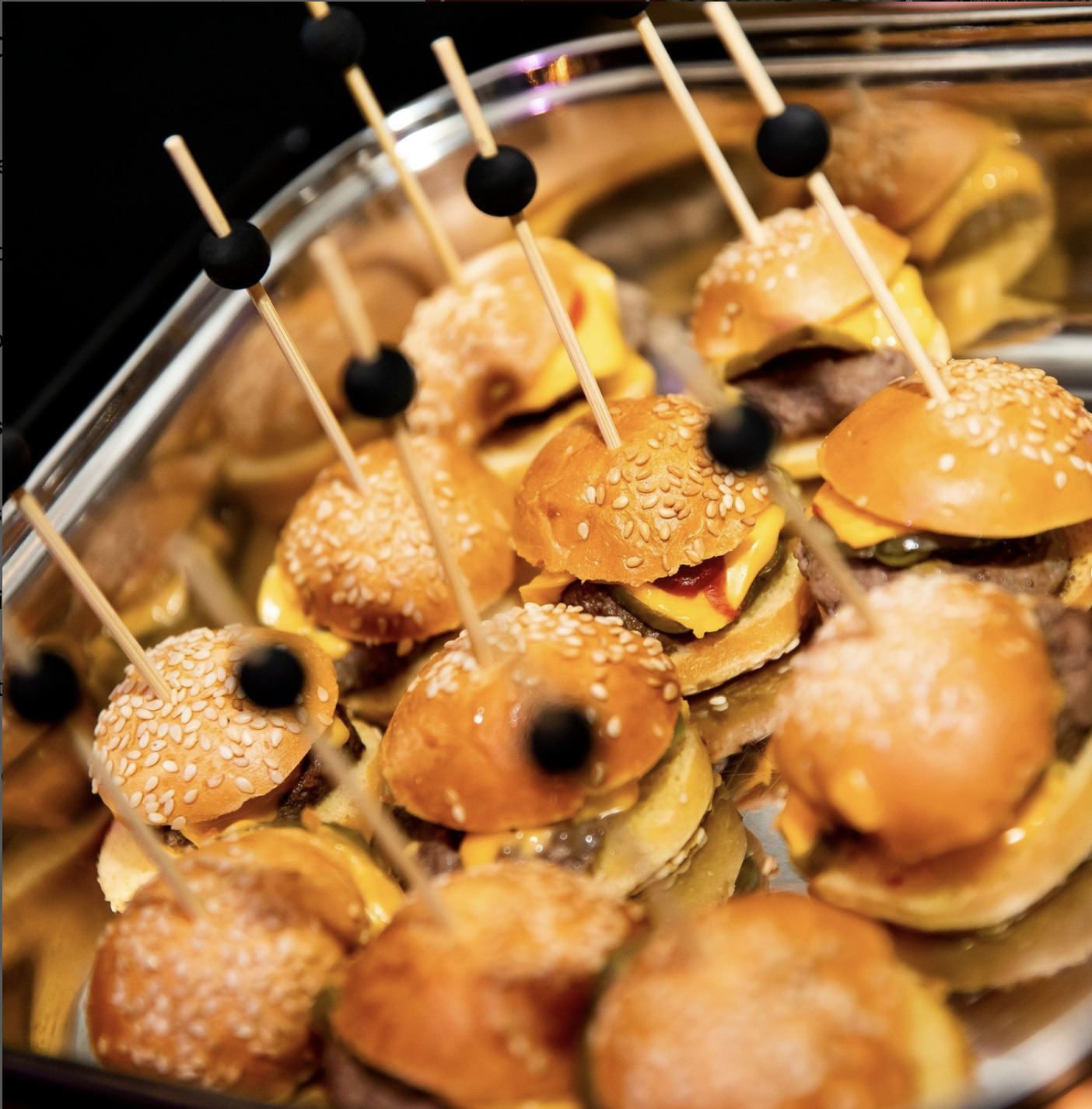 - Slider Bar – An array of different slider types, including an angus beef patty with cheddar cheese and caramelized onions; shredded pork with pomerey mustard, Swiss cheese and relish; and a fried chicken patty with cheddar cheese and dill pickles.