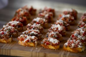 This option is an elegant one, perfect for any event or wedding cocktail hour menu! We start with a toasted baguette and top it with diced tomatoes, fresh herbs, olive oil, and grated parmesan cheese. It’s simple in nature, but because we use only the freshest ingredients, it’s a true bite of joy!