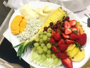 We also offer a simpler version of this in the form of our Cheeses, Spreads, and Fruits platter. This is a decorated presentation of brie, blue cheese crumbles, sliced New York cheddar and Swiss cheeses with hummus and spinach dip. We compliment these with seasonal fresh fruits and assorted crisps.
