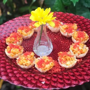 They are pastry shells filled with spicy mac and cheese and topped with a flaming dust. These are true crowd pleasers among kids and adults alike!