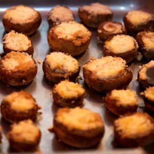Boursin is one of our favorite types of cheese for the herbs and mild flavor. It’s not an overpowering cheese, which is why guests love it! It pairs perfectly with earthy mushroom caps in one delightful bite. We dust the tops of each mushroom with Panko breadcrumbs as well for added crunch.