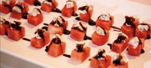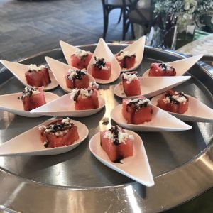 Perfect for a spring or summer event, these are watermelon cubes topped with feta, mint, shallot blend, and balsamic glaze. Talk about refreshing and delicious!