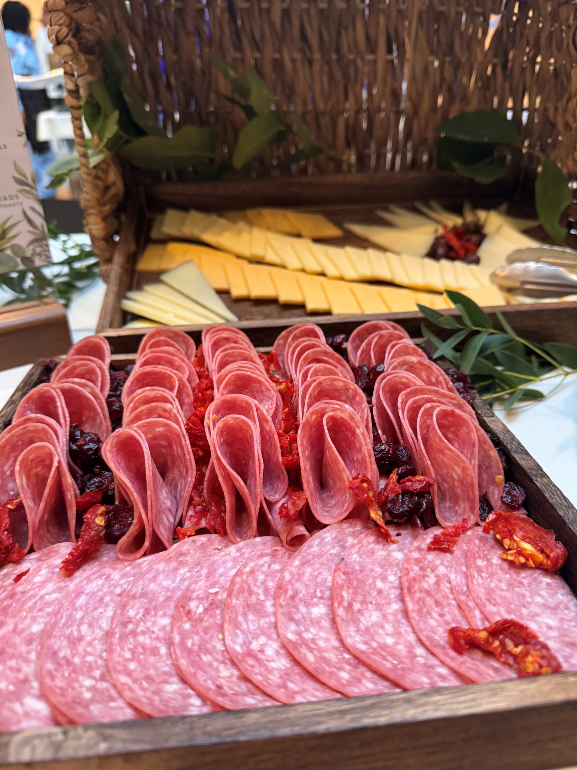So far, we’ve been sharing butler passed hors d’oeuvres ideas, but we also offer appetizer displays! One of the most popular displays we offer is the Meze Platter. This is a gourmet presentation of hummus, kalamata olives, genoa salami, herbed buffalo mozzarella balls, sliced provolone cheese, and balsamic marinated vegetables, all served with assorted crisps. It is truly a gorgeous grazing board that serves as both a delicious appetizer and an aesthetic focal point of your event/wedding cocktail hour!