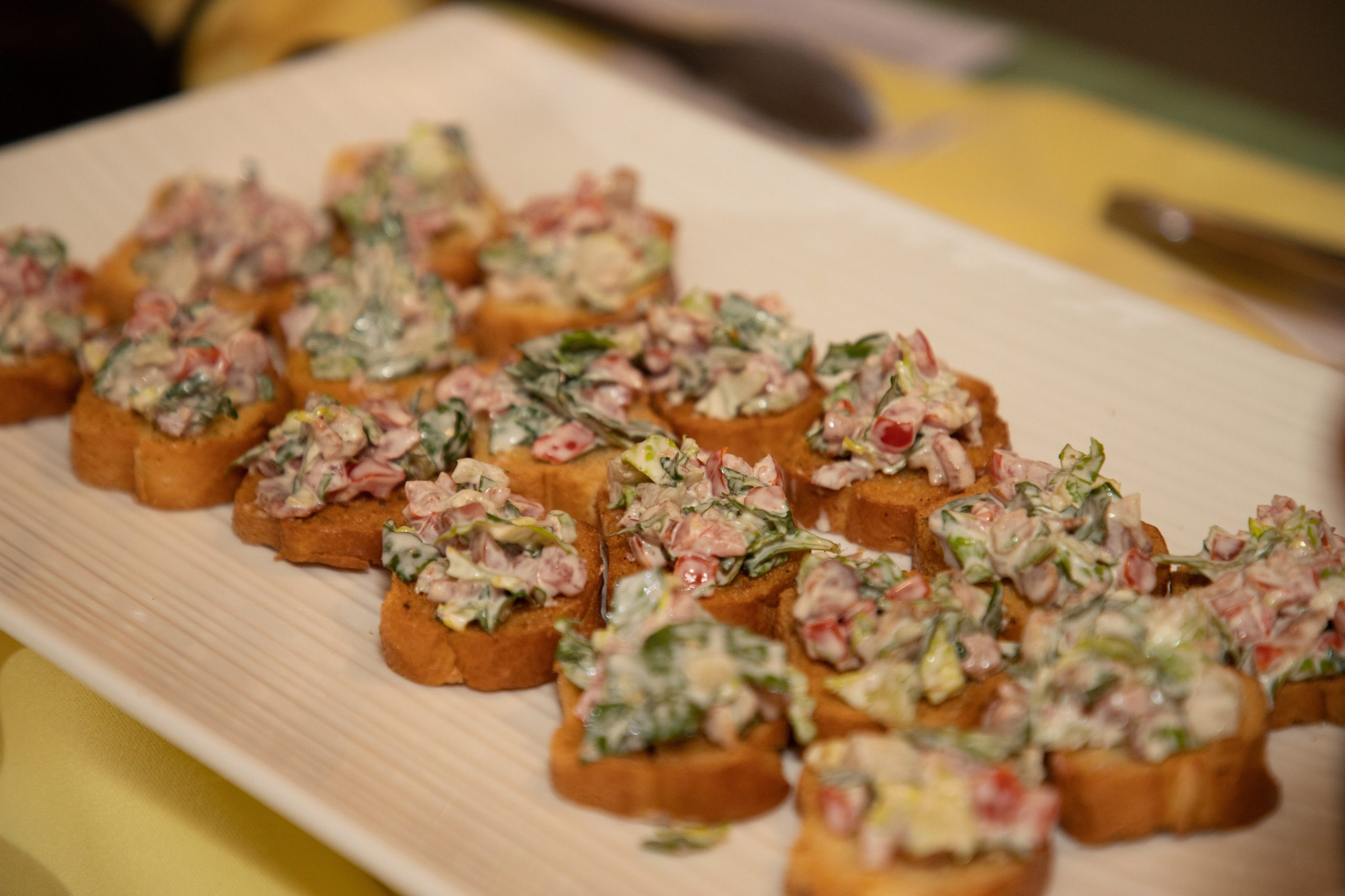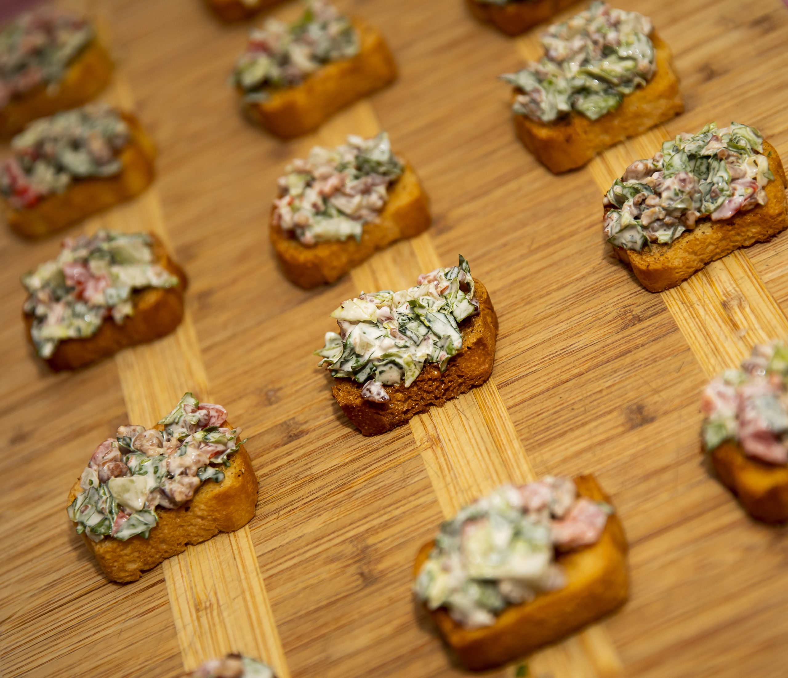 We love to put a twist on tradition around here, so this is our version of the classic BLT! Each bite features a mixture of shredded romaine, mayo, crumbled bacon, and diced tomatoes atop a toasted baguette. It’s the perfect handheld bite!