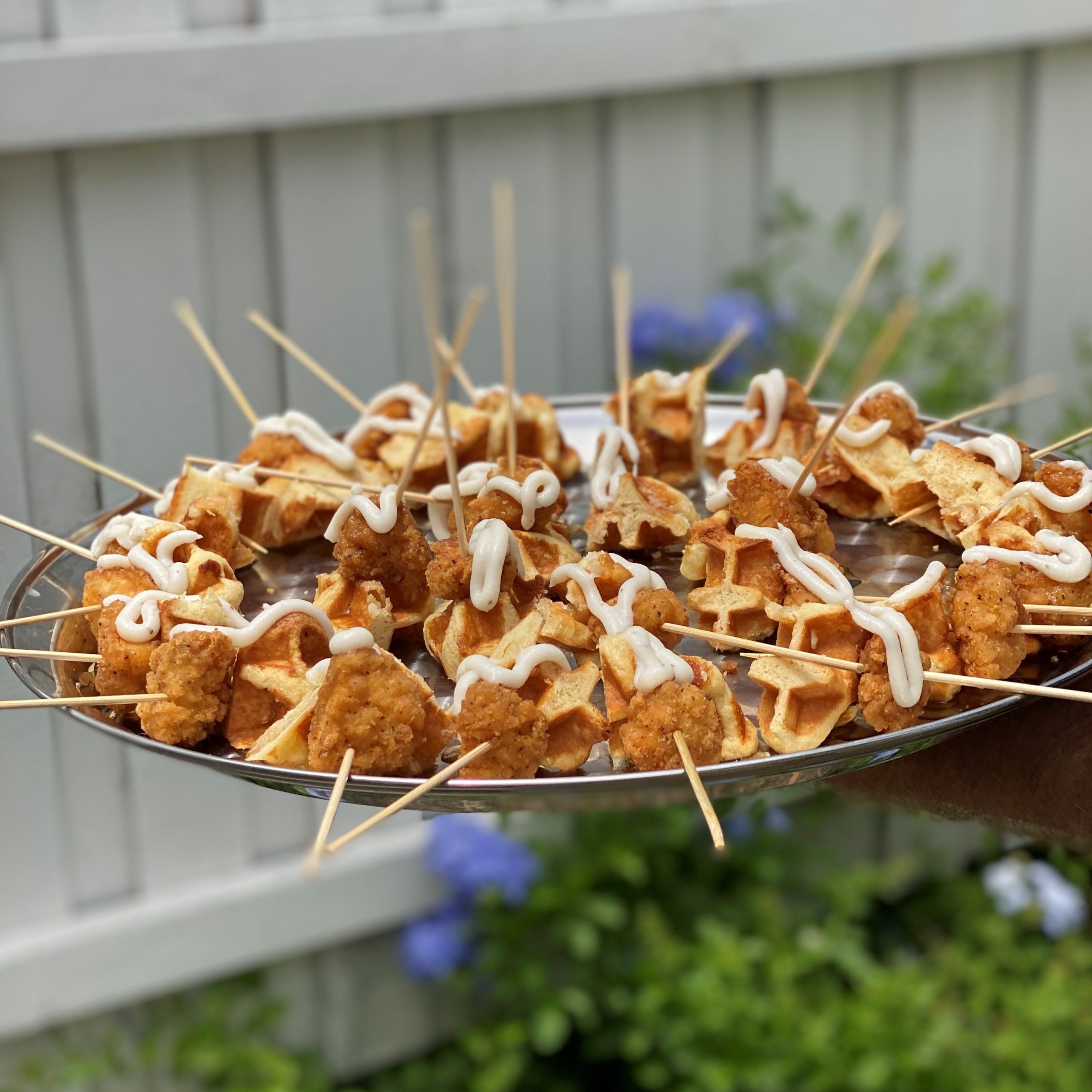 We are based in Florida, so of course we had to have a Southern-inspired option on the menu! These Belgian waffles are topped with fried chicken, country gravy, and maple syrup. Both sweet and savory with the right amount of crisp and crunch, this is one of our favorite hors d’oeuvres ideas!